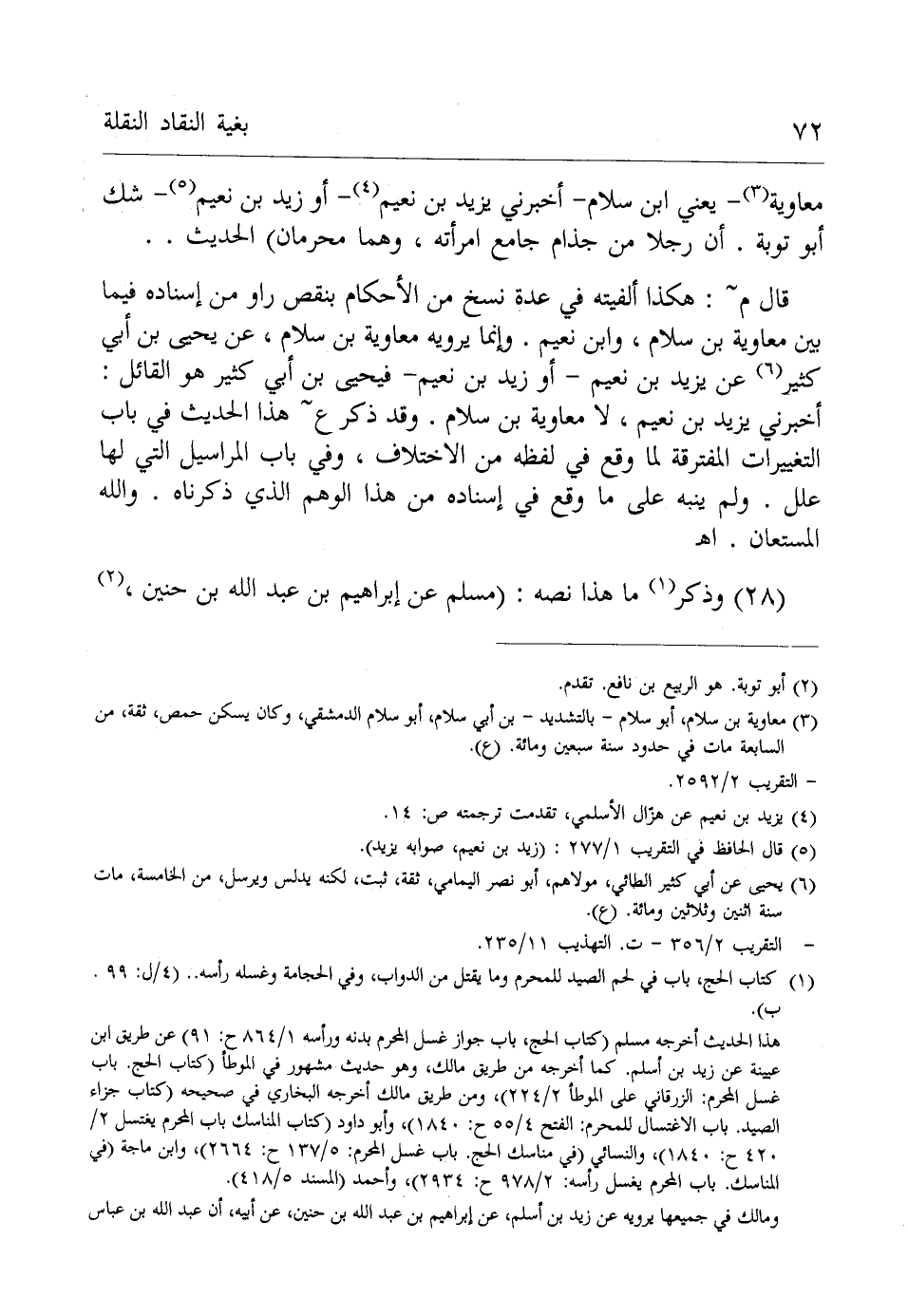 قال م: هكذا ألفيته في عدة نسخ من الأحكام بنقص راو من إسنده فيما بين معاوية بن سلام، وابن نعيم. وإنما يرويه معاوية بن سلام، عن يحيى بن أبي كثير (¬6) عن يزيد بن نعيم -أو زيد بن نعيم- فيحيى بن أبي كثير هو القائل: أَخبرني يزيد بن نعيم، لا معاوية بن سلام. وقد ذكر ع هذا الحديث في باب التغييرات المفترقة لما وقع في لفظه من الاختلاف، وفي باب المراسيل التي لها علل. ولم ينبه على ما وقع في إسناده من هذا الوهم الذي ذكرناه. والله المستعان. اهـ