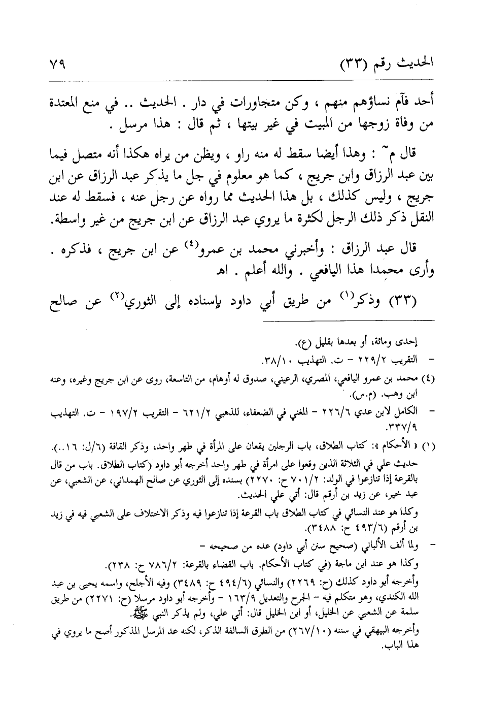 قال م: وهذا أيضا سقط له منه راو، ويظن من وراه هكذا أنه متصل فيما بين عبد الرزاق وابن جريج، كما هو معلوم في جل ما يذكر عبد الرزاق عن ابن جريج، وليس كذلك، بل هذا الحديث مما رواه عن رجل عنه، فسقط له عند النقل ذكر ذلك الرجل لكثرة ما يروي عبد الرزاق عن ابن جريج من غير واسطة.