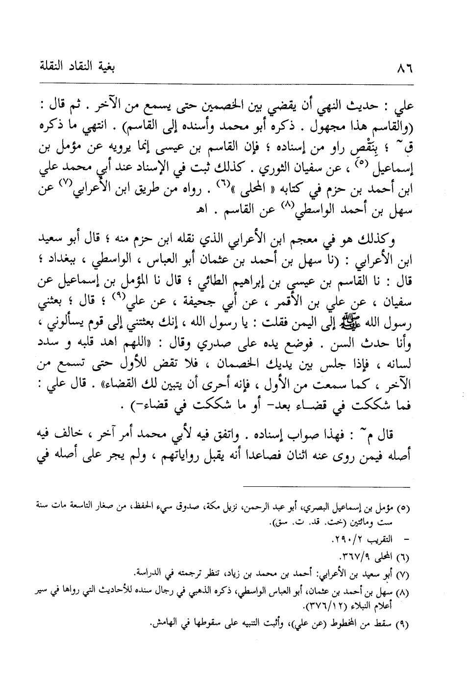 علي: حديث النهي أن يقضي بين الخصمين حتى يسمع من الآخر. ثم قال: (والقاسم هذا مجهول. ذكره أبو محمد وأسنده إلى القاسم). انتهي ما ذكره ق؛ بِنَقْص راو من إِسناده، فإن القاسم بن عيسى إنما يرويه عن مؤمل بن إسماعيل (¬5)، عن سفيان الثوري. كذلك ثبت في الإسناد عند أبي محمد علي ابن أحمد بن حزم في كتابه "المحلى" (¬6). رواه من طريق ابن الأعرابي (¬7) عن سهل بن أحمد الواسطي (¬8) عن القاسم. اهـ