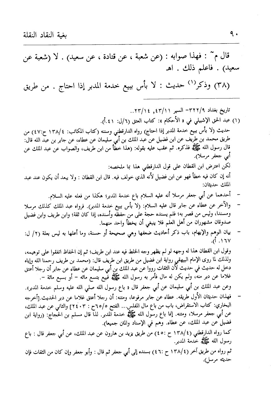 حديث (لا بأس ببيع خدمة المدبر إذا احتاج) رواه الدارقطني وسننه (كتاب المكاتب: 4/ 138 ح: 47) من طريق محمد بن طريف عن ابن فضيل عن عبد الملك بن أبي سليمان عن عطاء، عن جابر بن عبد الله قال: قال رسول الله - صلى الله عليه وسلم - فذكره. ثم عقب عليه بقوله: (هذا خطأ من ابن طريف، والصواب عن عبد الملك عن أبي جعفر مرسلا).