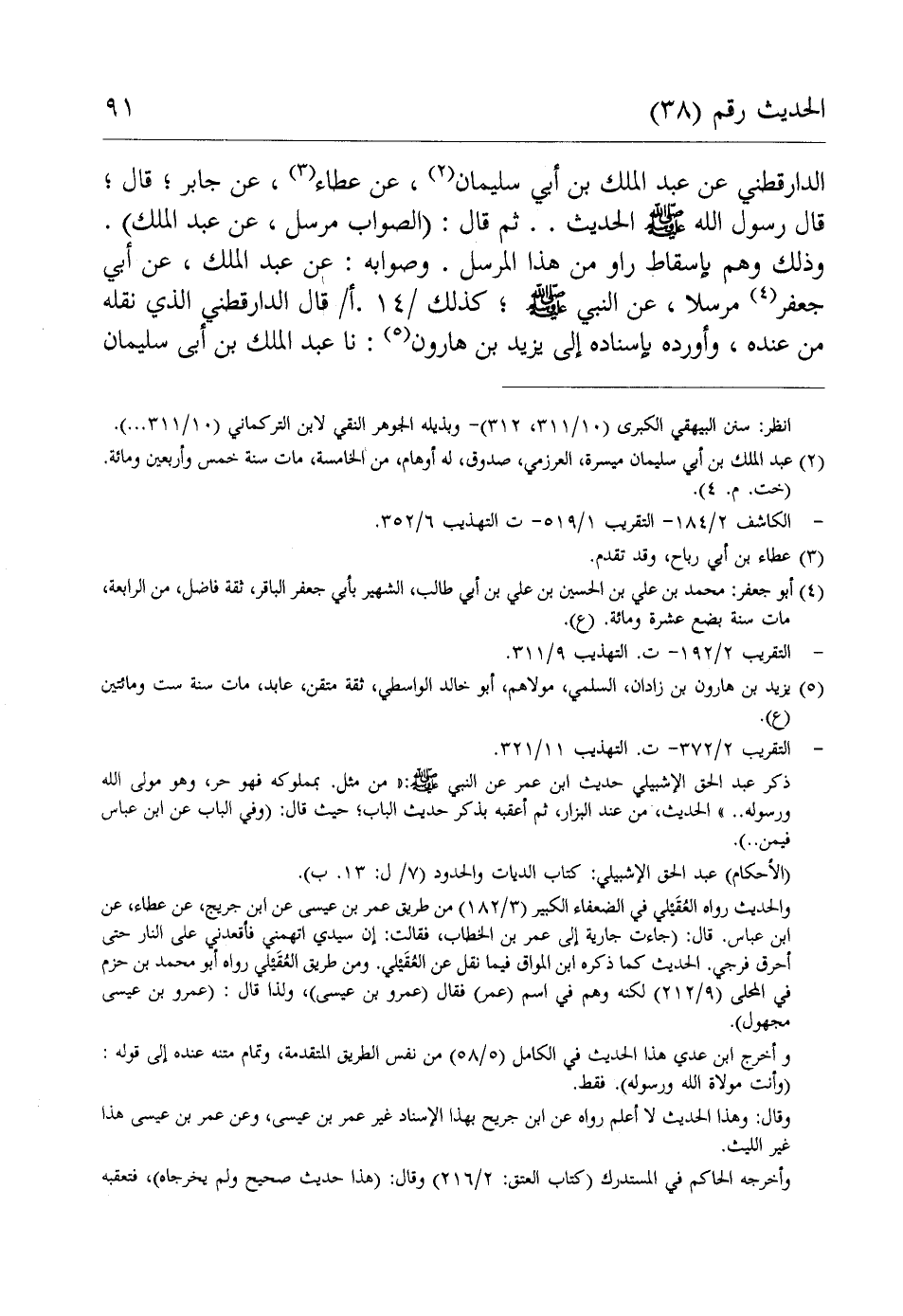الدارقطني عن عبد الملك بن أبي سليمان (¬2)، عن عطاء (¬3)، عن جابر؛ قال؛ قال رسول الله - صلى الله عليه وسلم - الحديث .. ثم قال: (الصواب مرسل، عن عبد الملك). وذلك وهم بإسقاط راو من هذا المرسل. وصوابه: عن عبد الملك، عن أبي جعفر (¬4) مرسلا، عن النبي - صلى الله عليه وسلم -؛ كذلك / 14. أ/ قال الدارقطني الذي نقله من عنده، وأورده بإسناده إلى يزيد بن هارون (¬5): نا عبد الملك بن أبي سليمان