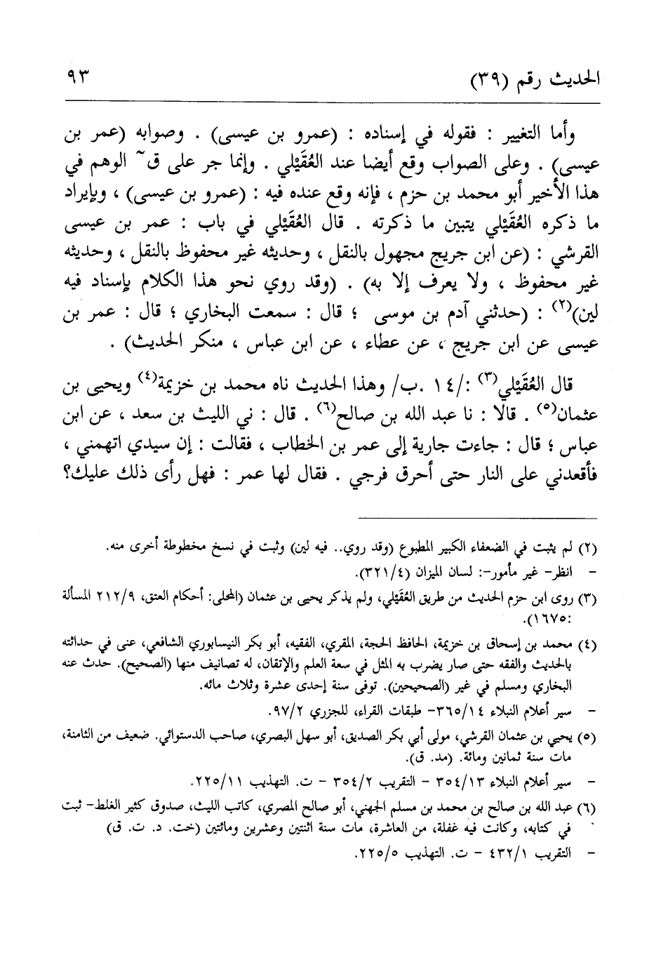(¬3) روى ابن حزم الحديث من طريق العُقَيْلي، ولم يذكر يحيى بن عثمان (المحلى: أحكام العتق، 9/ 212 المسألة: 1675).