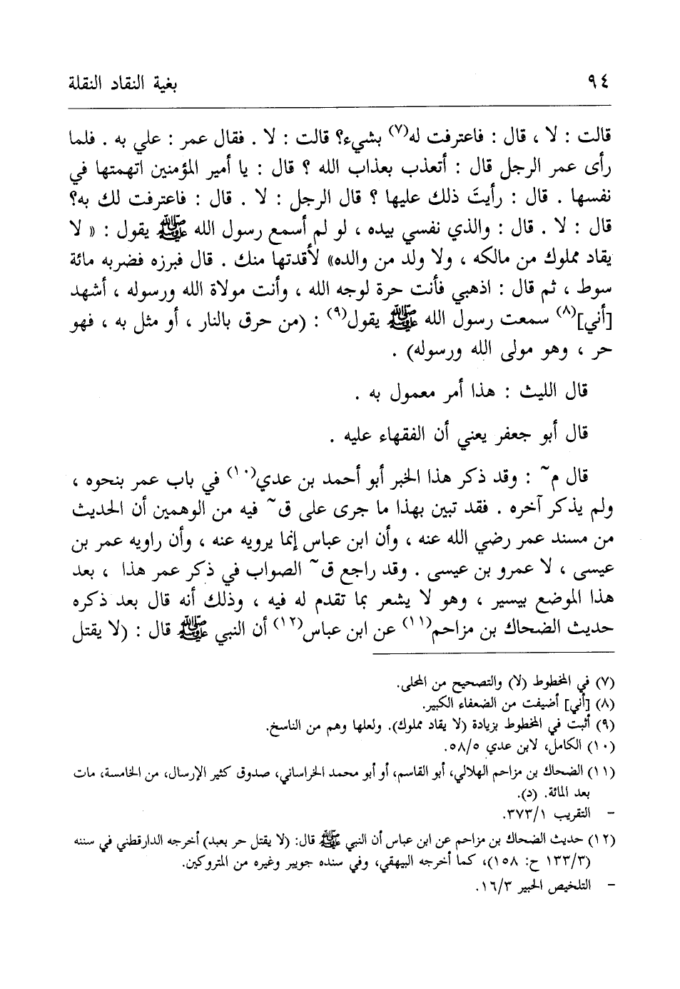 (¬12) حديث الضحاك بن مزاحم عن ابن عباس أن النبي - صلى الله عليه وسلم - قال: (لا يقتل حر بعبد) أخرجه الدارقطني في سننه (3/ 133 ح: 158)، كما أخرجه البيهقي، وفي سنده جويبر وغيره من المتروكين.