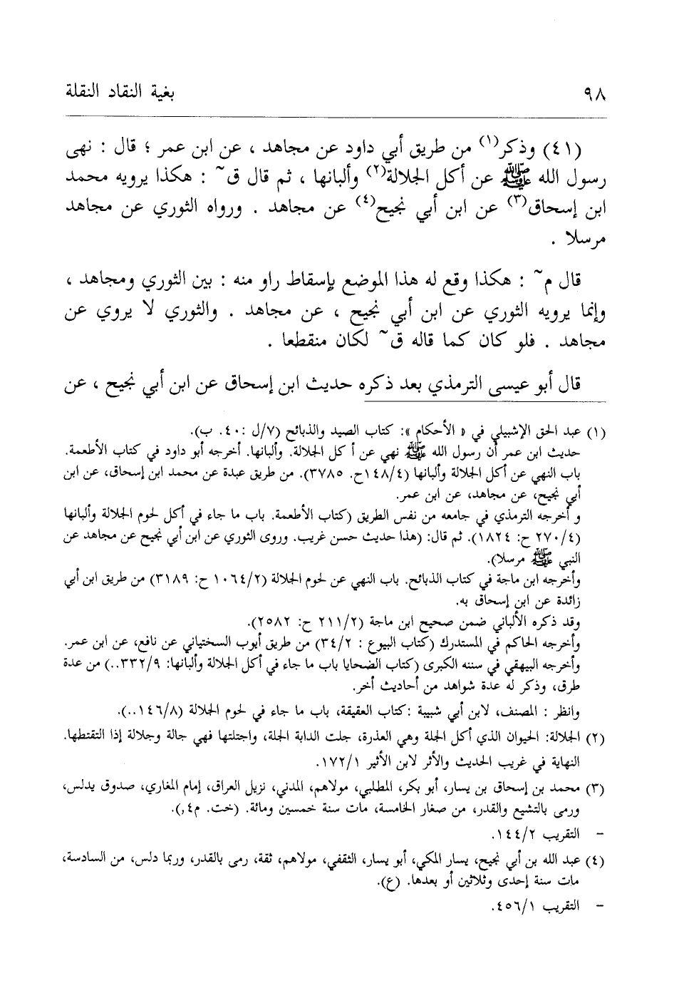 (41) وذكر (¬1) من طريق أبي داود عن مجاهد، عن ابن عمر؛ قال: نهى رسول الله - صلى الله عليه وسلم - عن أكل الجلالة (¬2) وألبانها، ثم قال ق: هكذا يرويه محمد ابن إسحاق (¬3) عن ابن أبي نجيح (¬4) عن مجاهد. ورواه الثوري عن مجاهد مرسلا.