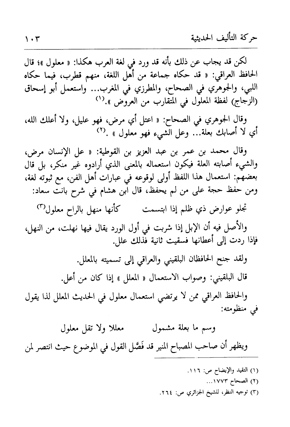 لكن قد يجاب عن ذلك بأنه قد ورد في لغة العرب هكذا: "معلول"؛ قال الحافظ العراقي: " قد حكاه جماعة من أهل اللغة، منهم قطرب، فيما حكاه اللبي، والجوهري في الصحاح، والمطرزي في المغرب ... واستعمل أبو إسحاق (الزجاج) لفظة المعلول في المتقارب من العروض". (¬1)