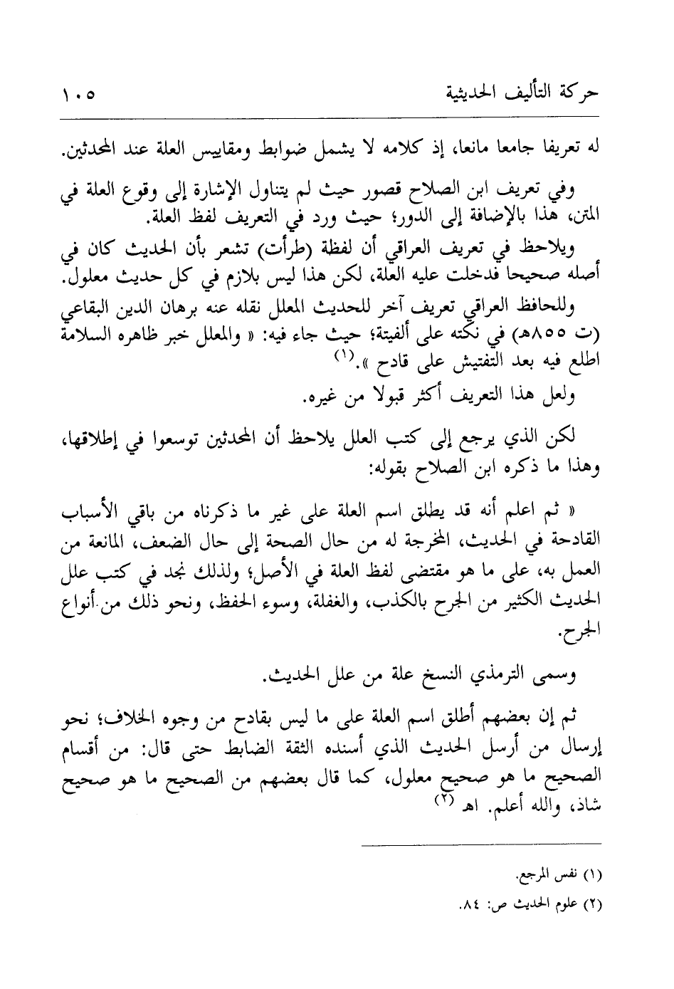 ثم إن بعضهم أطلق اسم العلة على ما ليس بقادح من وجوه الخلاف؛ نحو إرسال من أرسل الحديث الذي أسنده الثقة الضابط حتى قال: من أقسام الصحيح ما هو صحيح معلول، كما قال بعضهم من الصحيح ما هو صحيح شاذ، والله أعلم. اهـ (¬2)