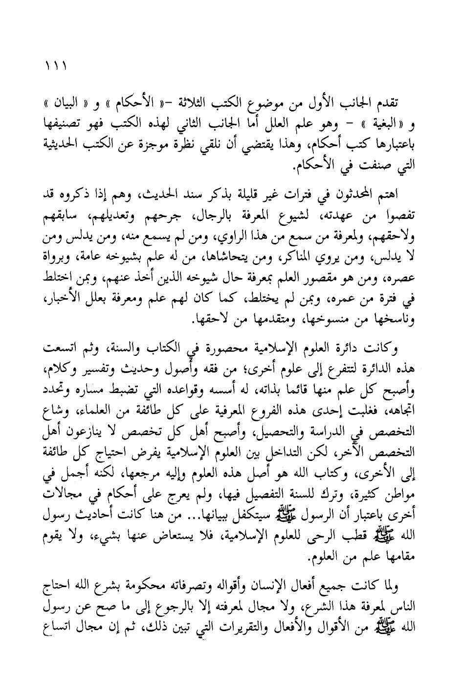 وكانت دائرة العلوم الإسلامية محصورة فى الكتاب والسنة، وثم اتسعت هذه الدائرة لتتفرع إلى علوم أخرى؛ من فقه وأصول وحديث وتفسير وكلام، وأصبح كل علم منها قائما بذاته، له أسسه وقواعده التي تضبط مساره وتحدد اتجاهه، فغلبت إحدى هذه الفروع المعرفية على كل طائفة من العلماء، وشاع التخصص فى الدراسة والتحصيل، وأصبح أهل كل تخصص لا ينازعون أهل التخصص الآخر، لكن التداخل بين العلوم الإسلامية يفرض احتياج كل طائفة إلى الأخرى، وكتاب الله هو أصل هذه العلوم وإليه مرجعها، لكنه أجمل في مواطن كثيرة، وترك للسنة التفصيل فيها، ولم يعرج على أحكام في مجالات أخرى باعتبار أن الرسول - صلى الله عليه وسلم - سيتكفل ببيانها ... من هنا كانت أحاديث رسول الله - صلى الله عليه وسلم - قطب الرحى للعلوم الإسلامية، فلا يستعاض عنها بشيء، ولا يقوم مقامها علم من العلوم.