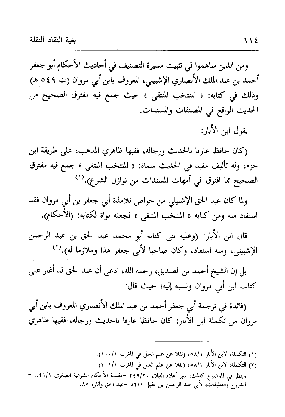 (فائدة في ترجمة أبي جعفر أحمد بن عبد الملك الأنصاري المعروف بابن أبي مروان من تكملة ابن الأبار: كان حافظا عارفا بالحديث ورجاله، فقيها ظاهري