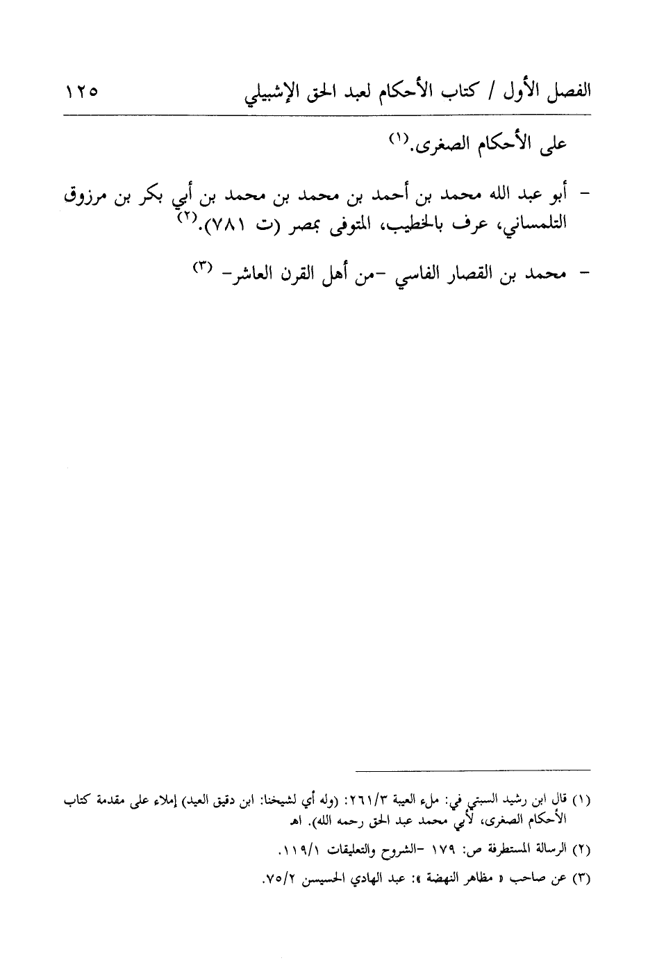 (¬1) قال ابن رشيد السبتي في: ملء العيبة 3/ 261: (وله أي لشيخنا: ابن دقيق العيد) إملاء على مقدمة كتاب الأحكام الصغرى، لأبي محمد عبد الحق -رَحِمَهُ اللهُ-). اهـ