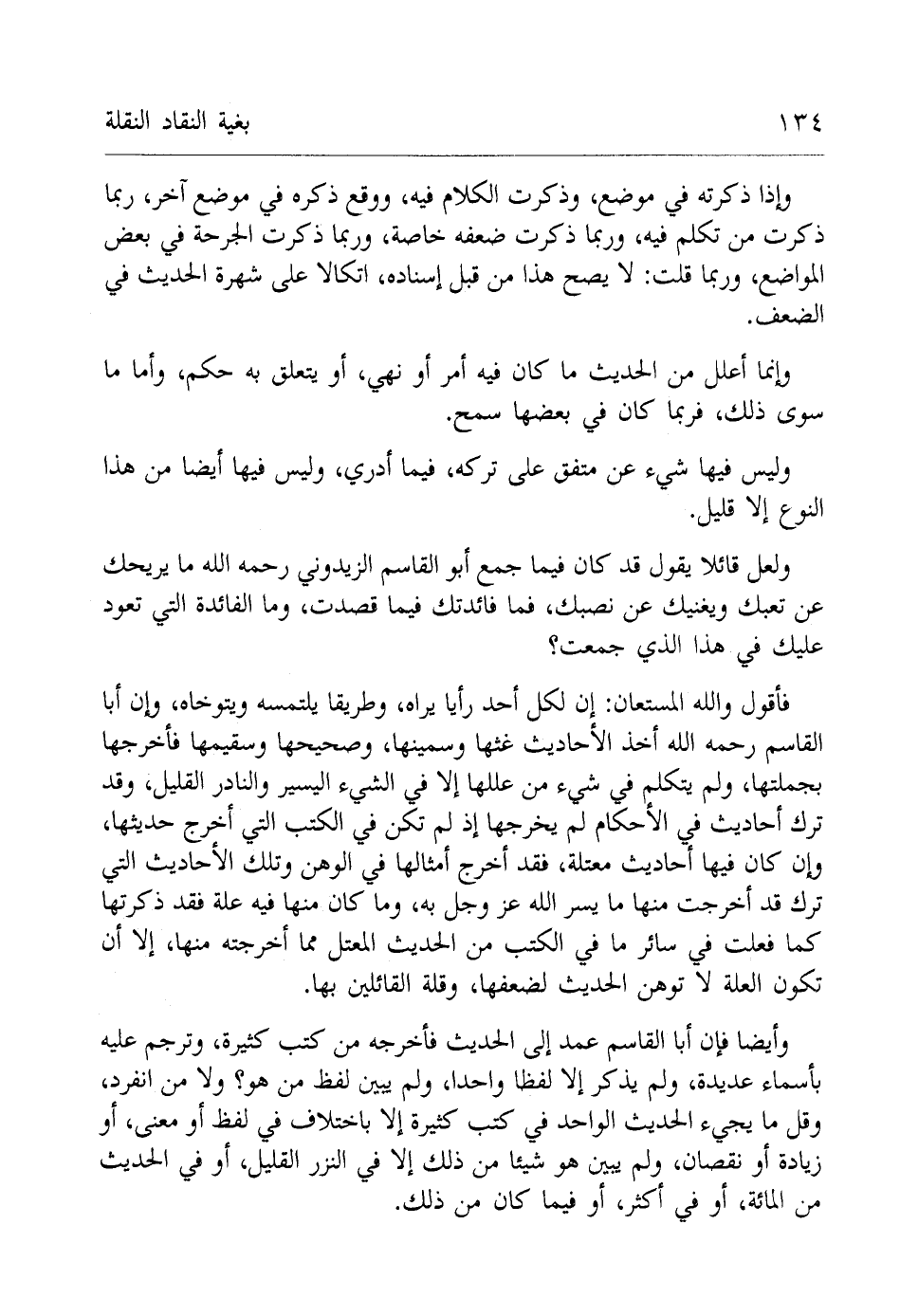 فأقول والله المستعان: إن لكل أحد رأيا يراه، وطريقا يلتمسه ويتوخاه، وإن أبا القاسم -رَحِمَهُ اللهُ- أخذ الأحاديث غثها وسمينها، وصحيحها وسقيمها فأخرجها بجملتها، ولم يتكلم في شئ من عللها إلا في الشيء اليسير والنادر القليل، وقد ترك أحاديث في الأحكام لم يخرجها إذ لم تكن في الكتب التي أخرج حديثها، وإن كان فيها أحاديث معتلة، فقد أخرج أمثالها في الوهن وتلك الأحاديث التي ترك قد أخرجت منها ما يسر الله -عَزَّ وَجَلَّ- به، وما كان منها فيه علة فقد ذكرتها كما فعلت في سائر ما في الكتب من الحديث المعتل مما أخرجته منها، إلا أن تكون العلة لا توهن الحديث لضعفها، وقلة القائلين بها.