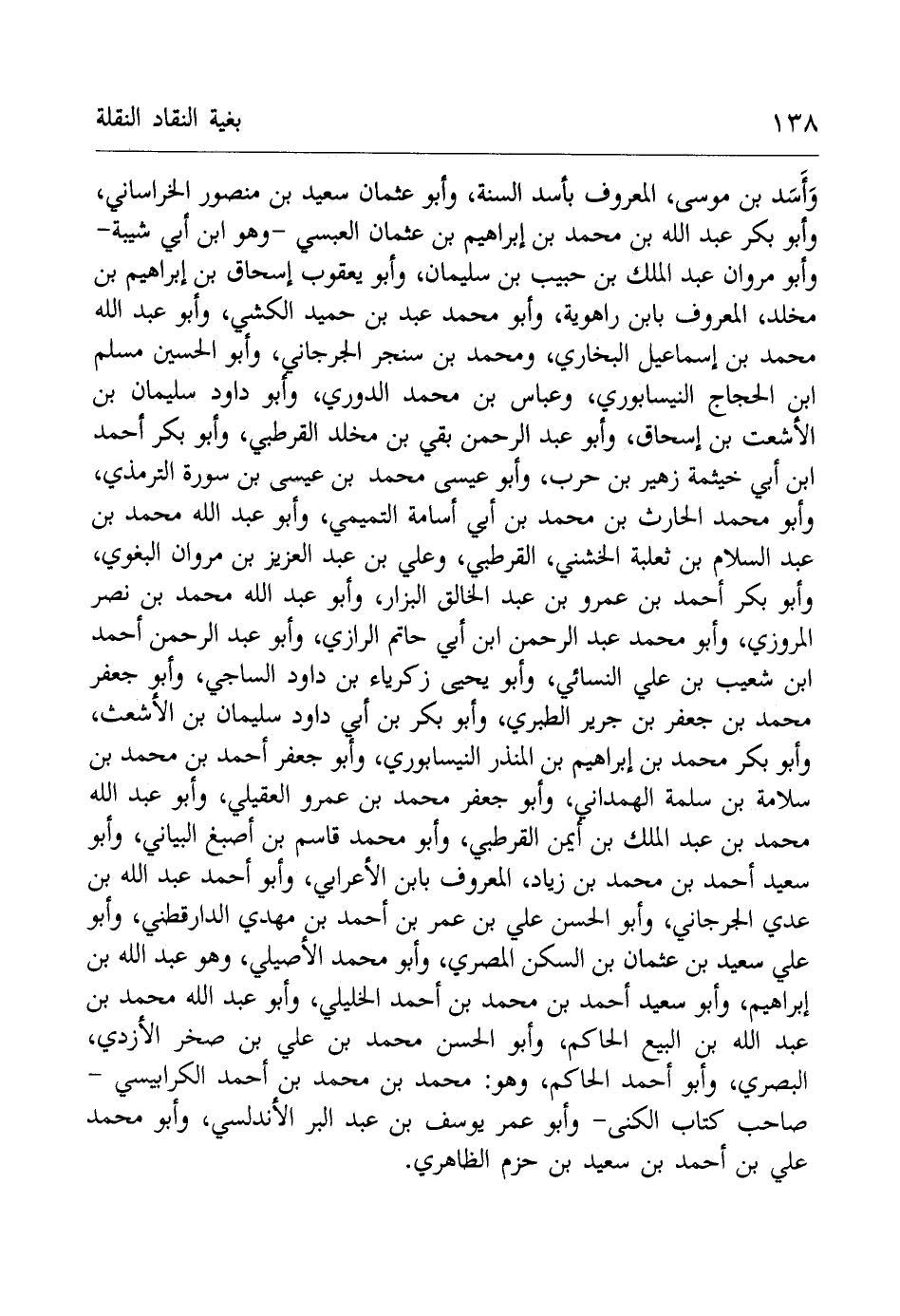 وَأَسَد بن موسى، المعروف بأسد السنة، وأبو عثمان سعيد بن منصور الخراسانى، وأبو بكر عبد الله بن محمد بن إبراهيم بن عثمان العبسي -وهو ابن أبي شيبة- وأو مروان عبد الملك بن حبيب بن سليمان، وأبو يعقوب إسحاق بن إبراهيم بن مخلد، المعروف بابن راهوية، وأبو محمد عبد بن حميد الكشي، وأبو عبد الله محمد بن إسماعيل البخاري، ومحمد بن سنجر الجرجانى، وأبو الحسين مسلم ابن الحجاج النيسابوري، وعباس بن محمد الدوري، وأبو داود سليمان بن الأشعت بن إسحاق، وأبو عبد الرحمن بقي بن مخلد القرطبي، وأبو بكر أحمد ابن أبي خيثمة زهير بن حرب، وأبو عيسى محمد بن عيسى بن سورة الترمذي، وأبو محمد الحارث بن محمد بن أبي أسامة التميمي، وأبو عبد الله محمد بن عبد السلام بن ثعلبة الخشني، القرطبي، وعلي بن عبد العزيز بن مروان البغوي، وأبو بكر أحمد بن عمرو بن عبد الخالق البزار، وأبو عبد الله محمد بن نصر الروزي، وأبو محمد عبد الرحمن ابن أبي حاتم الرازي، وأبو عبد الرحمن أحمد ابن شعيب بن علي النسائي، وأبو يحيى زكرياء بن داود الساجي، وأبو جعفر محمد بن جعفر بن جرير الطبري، وأبو بكر بن أبي داود سليمان بن الأشعث، وأبو بكر محمد بن إبراهيم بن المنذر النيسابوري، وأبو جعفر أحمد بن محمد بن سلامة بن سلمة الهمداني، وأبو جعفر محمد بن عمرو العقيلي، وأبو عبد الله محمد بن عبد الملك بن أيمن القرطبي، وأبو محمد قاسم بن أصبغ البياني، وأبو سعيد أحمد بن محمد بن زياد، المعروف بابن الأعرابي، وأبو أحمد عبد الله بن عدي الجرجاني، وأبو الحسن علي بن عمر بن أحمد بن مهدي الدارقطني، وأبو علي سعيد بن عثمان بن السكن الصري، وأبو محمد الأصيلي، وهو عبد الله بن إبراهيم، وأبو سعيد أحمد بن محمد بن أحمد الخليلي، وأبو عبد الله محمد بن عبد الله بن البيع الحاكم، وأبو الحسن محمد بن علي بن صخر الأزدي، البصري، وأبو أحمد الحاكم، وهو: محمد بن محمد بن أحمد الكرابيسي -صاحب كتاب الكنى- وأبو عمر يوسف بن عبد البر الأندلسي، وأبو محمد علي بن أحمد بن سعيد بن حزم الظاهري.