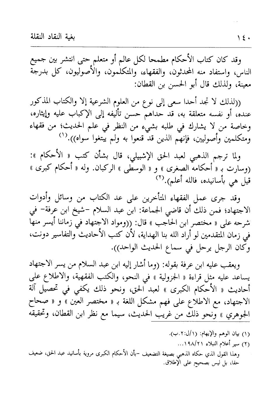 ولا ترجم الذهبي لعبد الحق الإشبيلي، قال بشأن كتب "الأحكام": (وسارت بـ"أحكامه الصغرى" و"الوسطى" الركبان. وله "أحكام كبرى" قيل هي بأسانيده، فالله أعلم). (¬2)