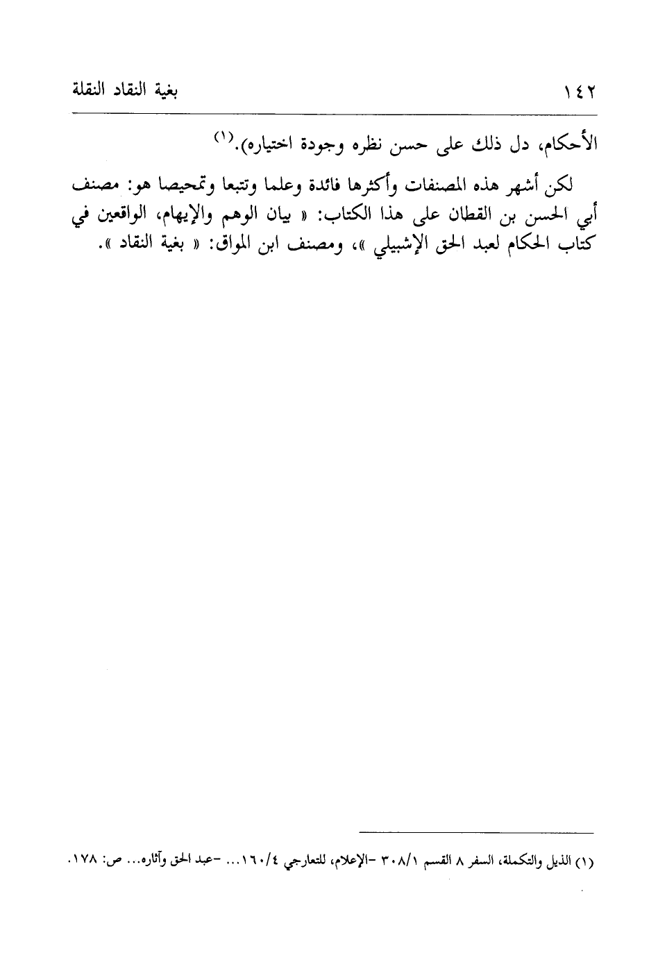 لكن أشهر هذه المصنفات وأكثرها فائدة وعلما وتتبعا وتمحيصا هو: مصنف أبي الحسن بن القطان على هذا الكتاب: "بيان الوهم والإيهام، الواقعين في كتاب الحكام لعبد الحق الإشبيلي"، ومصنف ابن المواق: "بغية النقاد".