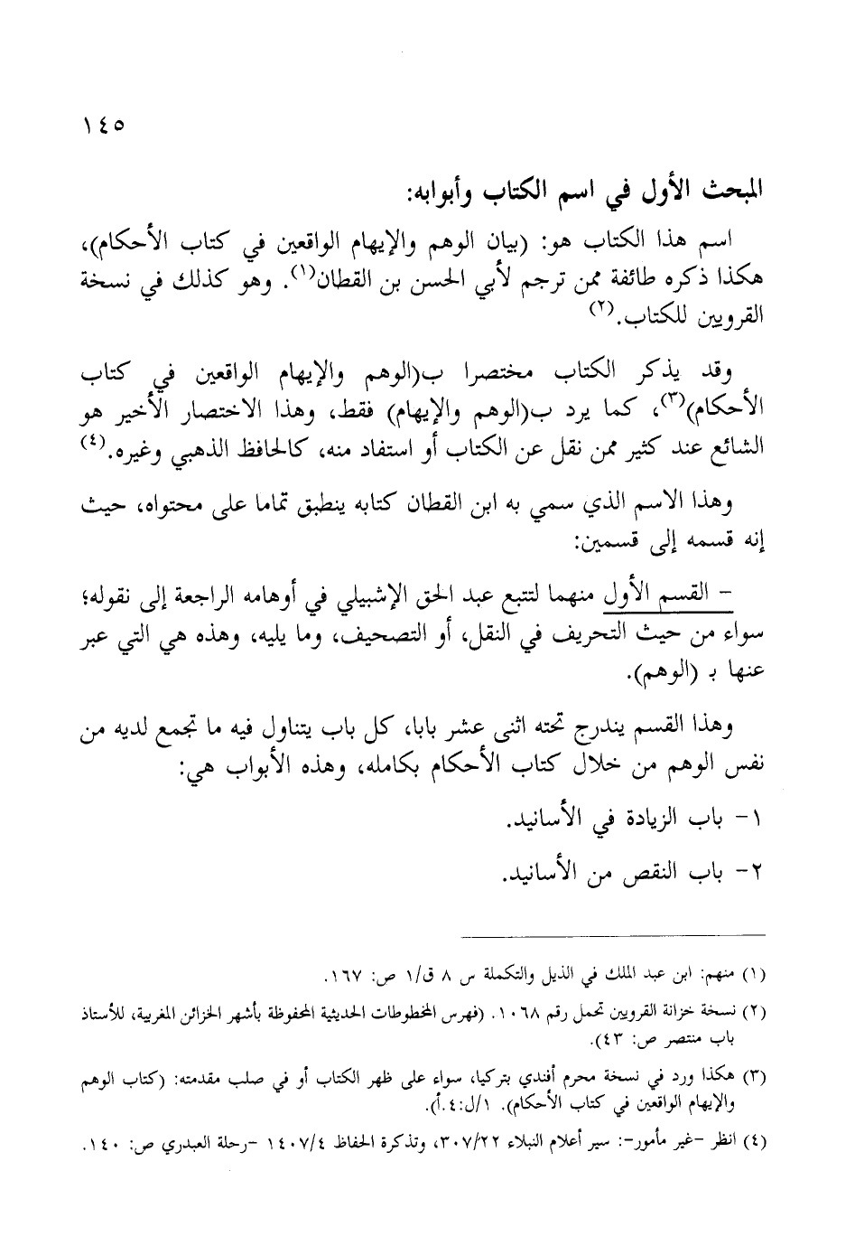 (¬3) هكذا ورد فى نسخة محرم أفندي بتركيا، سواء على ظهر الكتاب أو في صلب مقدمته: (كتاب الوهم والإيهام الواقعين في كتاب الأحكام (1/ل: 4. أ).