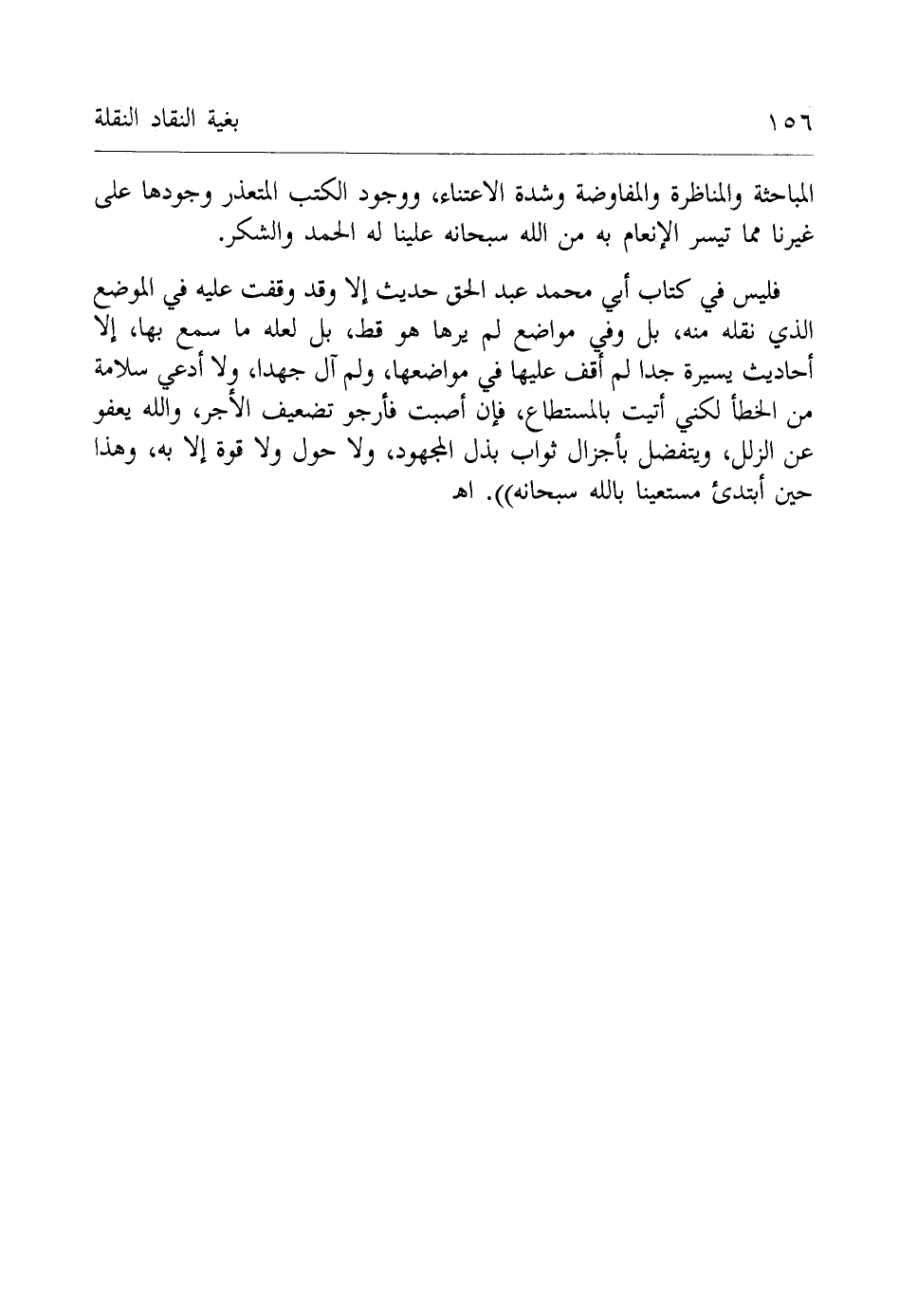فليس في كتاب أبي محمد عبد الحق حديث إلا وقد وقفت عليه في الموضع الذي نقله منه، بل وفي مواضع لم يرها هو قط، بل لعله ما سمع بها، إلا أحاديث يسيرة جدا لم أقف عليها في مواضعها، ولم آل جهدا، ولا أدعي سلامة من الخطأ لكني أتيت بالمستطاع، فإن أصبت فأرجو تضعيف الأجر، والله يعفو عن الزلل، ويتفضل بأجزال ثواب بذل المجهود، ولا حول ولا قوة إلا به، وهذا حين أبتدئ مستعينا بالله سبحانه". اهـ