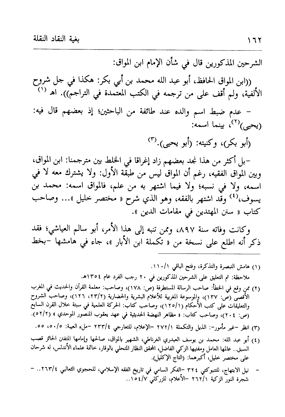 "ابن المواق الحافظ، أبو عبد الله محمد بن أبي بكر: هكذا في جل شروح الألفية، ولم أقف على من ترجمه في الكتب المعتمدة في التراجم". اهـ (¬1)
