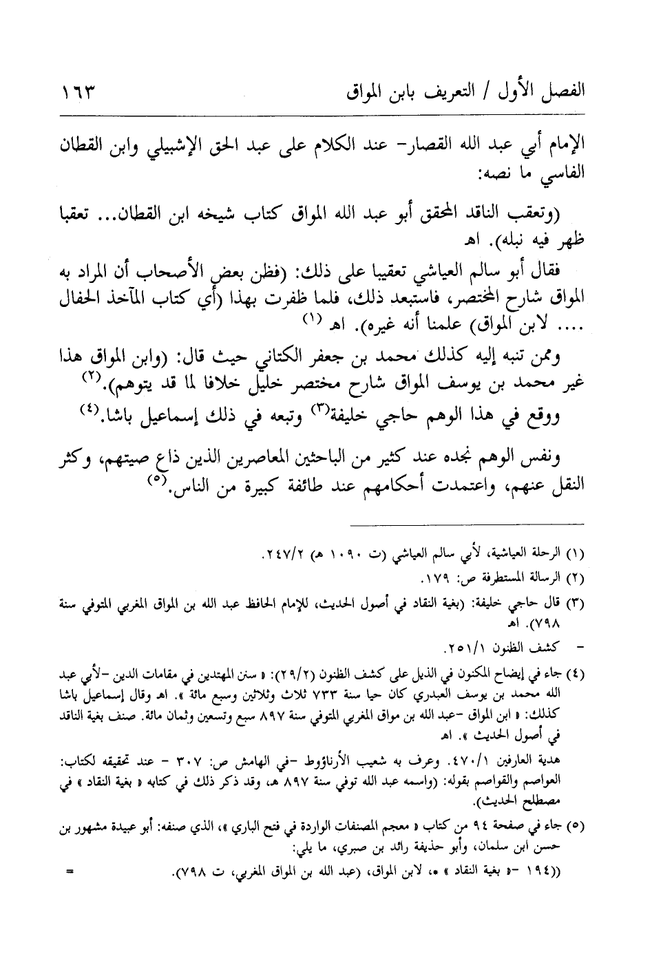 (¬5) جاء في صفحة 94 من كتاب "معجم المصنفات الواردة في فتح الباري"، الذي صنفه: أبو عبيدة مشهور بن حسن ابن سلمان، وأبو حذيفة رائد بن صبري، ما يلي: (194 - "بغية النقاد"، لإبن المواق، (عبد الله بن المواق المغربي، ت 798). =