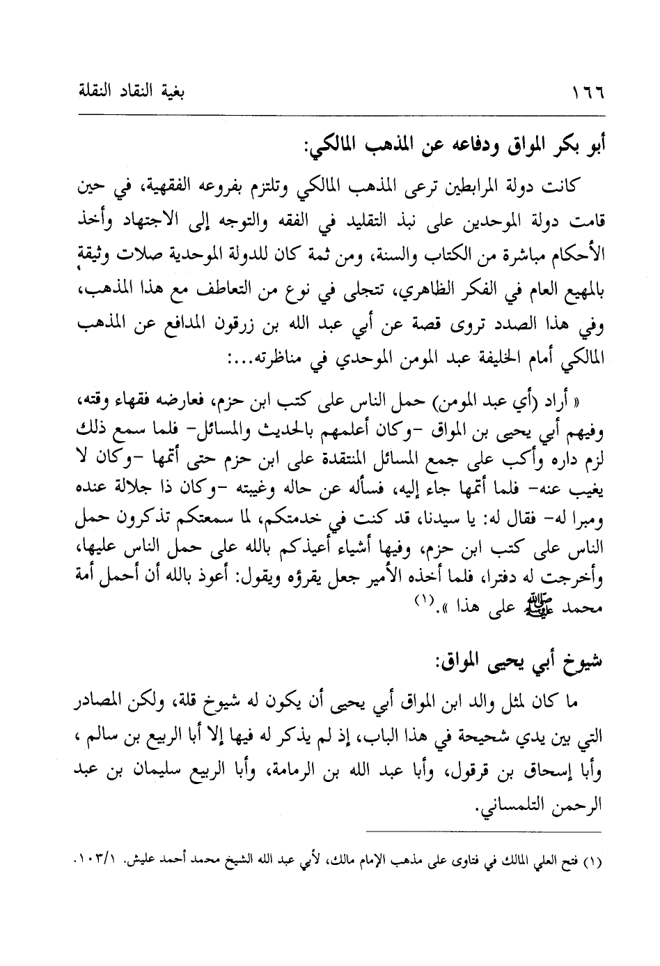 "أراد (أي عبد المومن) حمل الناس على كتب ابن حزم، فعارضه فقهاء وقته، وفيهم أبي يحيى بن المواق -وكان أعلمهم بالحديث والمسائل- فلما سمع ذلك لزم داره وأكب على جمع المسائل المنتقدة على ابن حزم حتى أتمها -وكان لا يغيب عنه- فلما أتمها جاء إليه، فسأله عن حاله وغيبته -وكان ذا جلالة عنده ومبرا له- فقال له: يا سيدنا، قد كنت فى خدمتكم، لما سمعتكم تذكرون حمل الناس على كتب ابن حزم، وفيها أشياء أعيذكم بالله على حمل الناس عليها، وأخرجت له دفترا، فلما أخذه الأمير جعل يقرؤه ويقول: أعوذ بالله أن أحمل أمة محمد - صلى الله عليه وسلم -على هذا". (¬1)