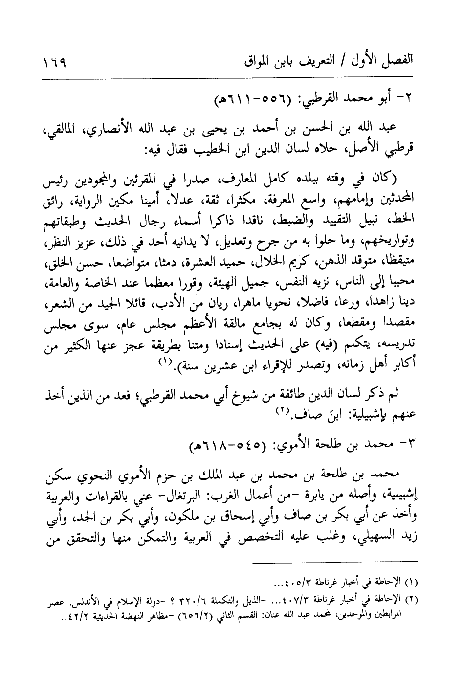 ثم ذكر لسان الدين طائفة من شيوخ أبي محمد القرطبي، فعد من الذين أخذ عنهم بإشبيلية: ابن صاف. (¬2)