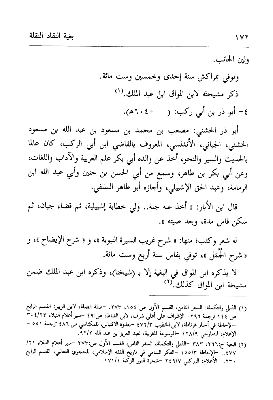 (¬2) البغية ح: 266، 383 - الذيل والتكملة، السفر الثامن، القسم الأول ص: 273 - سير أعلام النبلاء 21/ 477. . - الإحاطة 3/ 155 - الفكر السامي في تاريخ الفقه الإسلامي، للحجوي الثعالبي، القسم الرابع 230.- الأعلام: الزركلي 7/ 249 - شجرة النور الزكية 1/ 171.