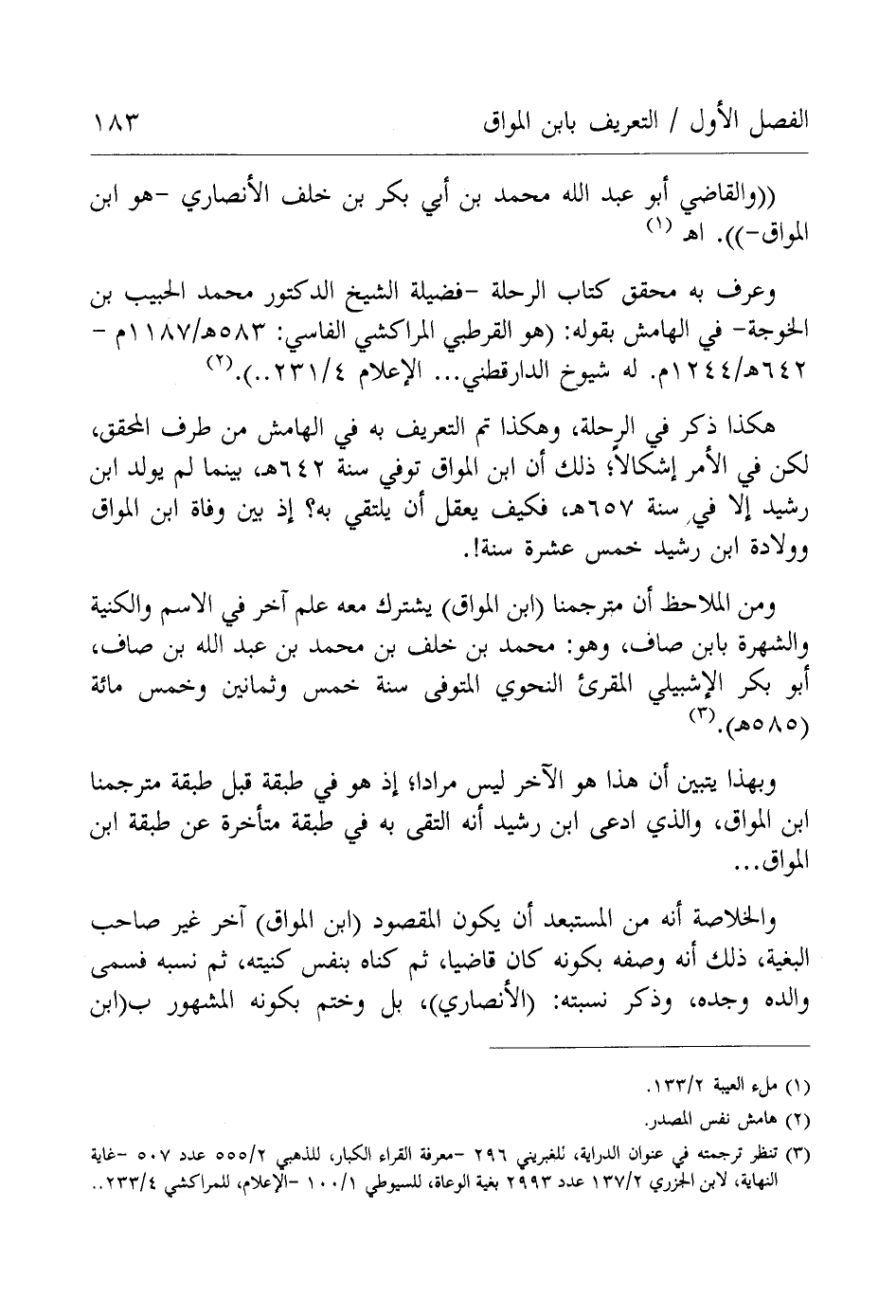 وعرف به محقق كتاب الرحلة -فضيلة الشيخ الدكتور محمد الحبيب بن الخوجة- في الهامش بقوله: (هو القرطبي المراكشي الفاسي: 583 هـ / 1187 م- 642 هـ/ 1244 م. له شيوخ الدارقطني ... الإعلام 4/ 231 ..). (¬2)