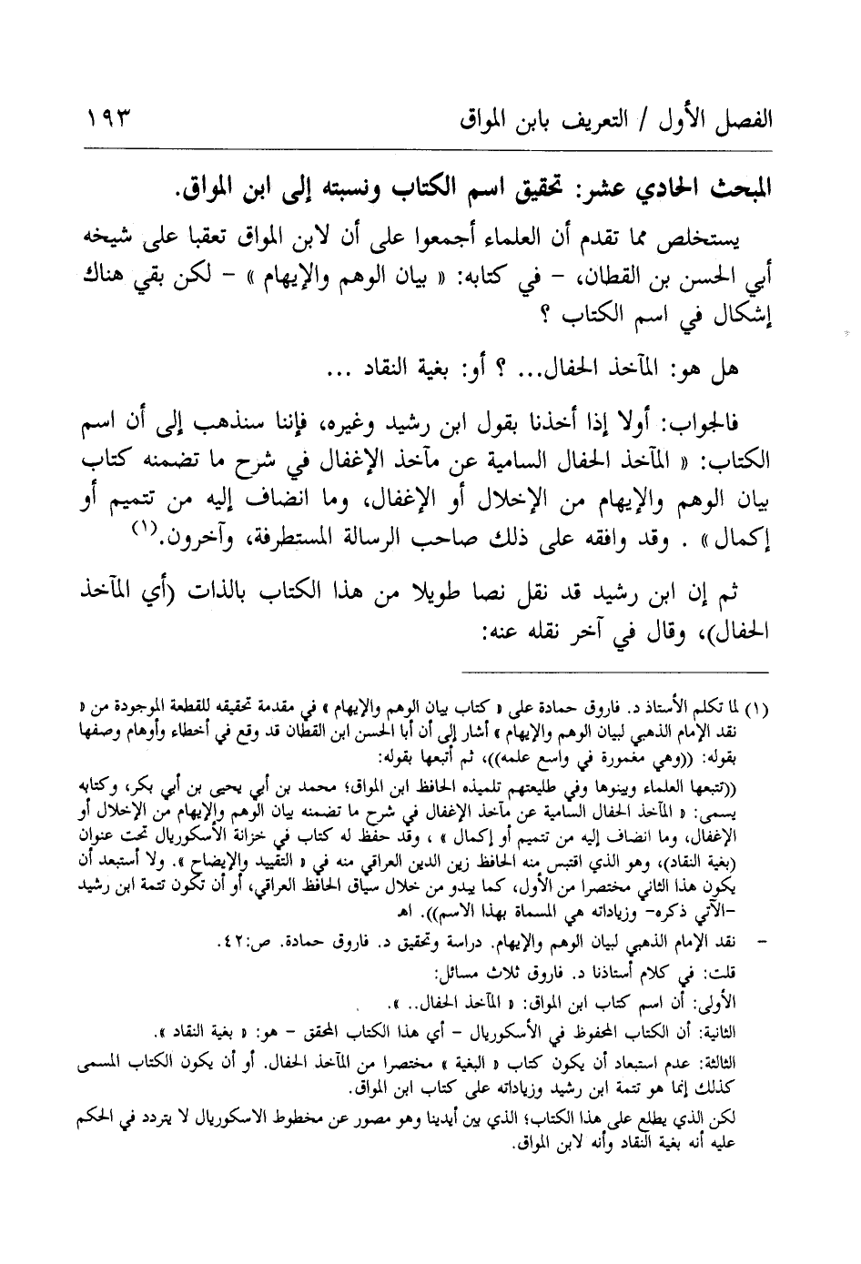 (¬1) لما تكلم الأستاذ د. فاروق حمادة على "كتاب بيان الوهم والإيهام" في مقدمة تحقيقه للقطعة الموجودة من "نقد الإمام الذهبي لبيان الوهم والإيهام" أشار إلى أن أبا الحسن ابن القطان قد وقع في أخطاء وأوهام وصفها بقوله: "وهي مغمورة في واسع علمه"، ثم أتبعها بقوله: