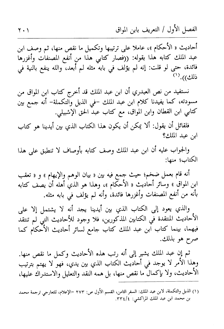 نستفيد من نص العبدري أن ابن عبد الملك قد أخرج كتاب ابن المواق من مسودته، كما يفيدنا كلام ابن عبد الملك -في الذيل والتكملة- أنه جمع بين كتابي ابن القطان وابن المواق، مع كتاب عبد الحق الإشبيلي.
