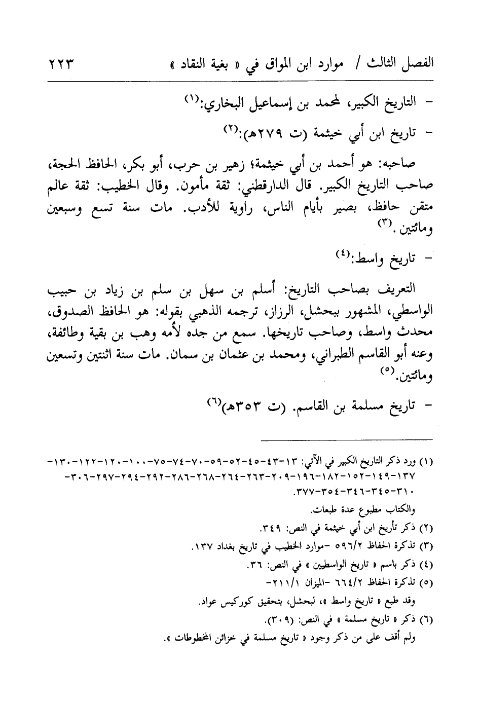 (¬1) ورد ذكر التاريخ الكبير في الآتي: 13 - 43 - 45 - 52 - 59 - 70 - 74 - 75 - 100 - 120 - 122 - 130 - 137 - 149 - 152 - 182 - 196 - 209 - 263 - 264 - 268 - 286 - 292 - 294 - 297 - 306 - 310 - 40 - 345 - 346 - 354 - 377.