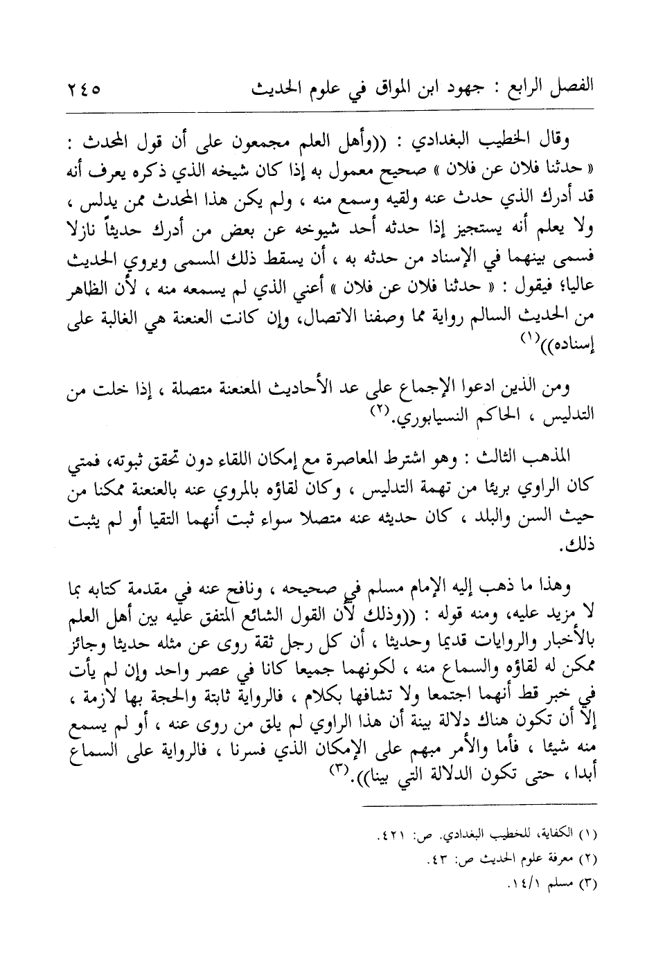 وهذا ما ذهب إليه الإمام مسلم في صحيحه، ونافح عنه في مقدمة كتابه بما لا مزيد عليه، ومنه قوله: "وذلك لأن القول الشائع المتفق عليه بين أهل العلم بالأخبار والروايات قديما وحديثا، أن كل رجل ثقة روى عن مثله حديثا وجائز ممكن له لقاؤه والسماع منه، لكونهما جميعا كانا في عصر واحد وإن لم يأت في خبر قط أنهما اجتمعا ولا تشافها بكلام، فالرواية ثابتة والحجة بها لازمة، إلا أن تكون هناك دلالة بينة أن هذا الراوي لم يلق من روى عنه، أو لم يسمع منه شيئا، فأما والأمر مبهم على الإمكان الذي فسرنا، فالرواية على السماع أبدا، حتى تكون الدلالة التي بينا ". (¬3)