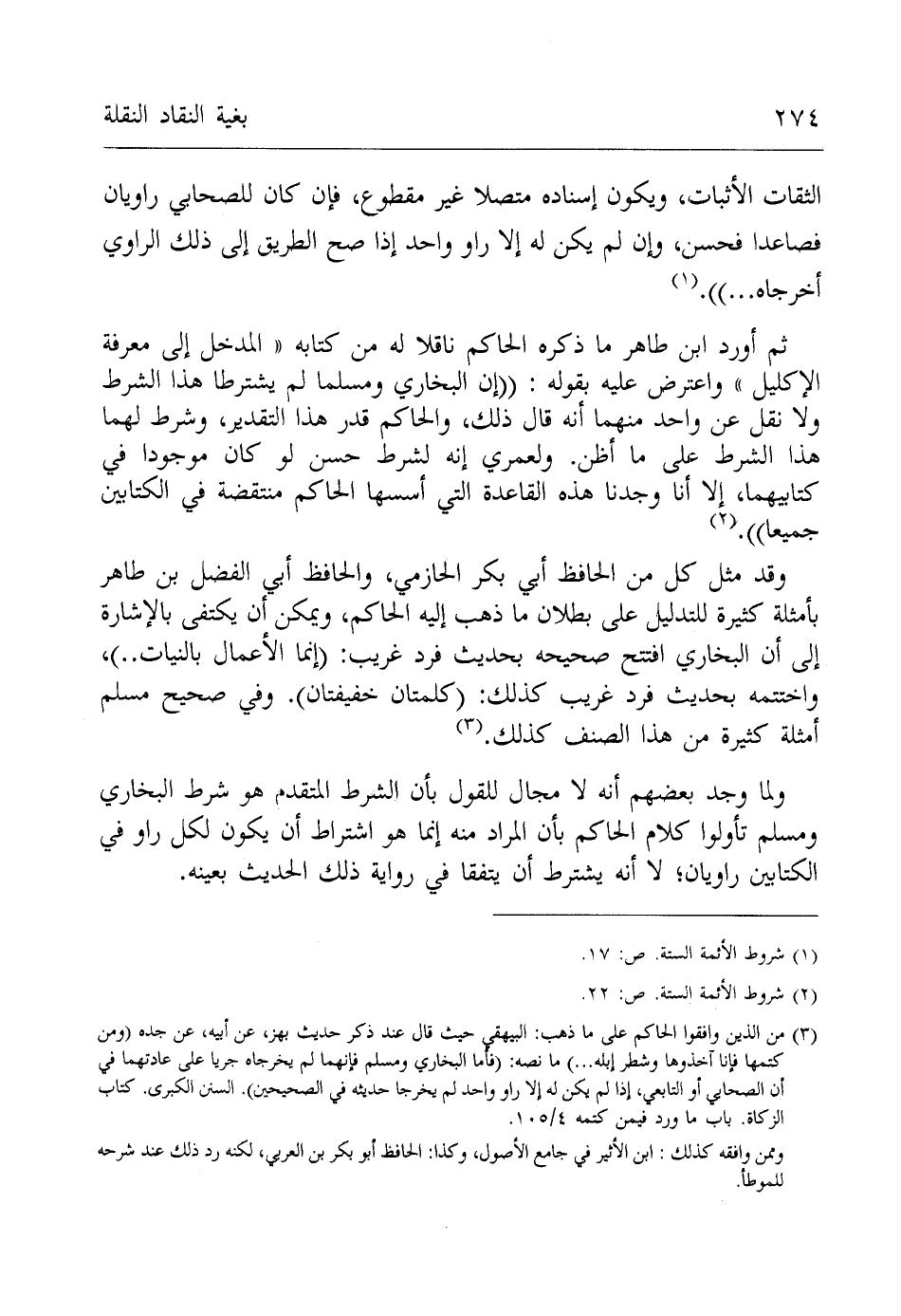 ثم أورد ابن طاهر ما ذكره الحاكم ناقلا له من كتابه "المدخل إلى معرفة الإكليل" واعترض عليه بقوله: "إن البخاري ومسلما لم يشترطا هذا الشرط ولا نقل عن واحد منهما أنه قال ذلك، والحاكم قدر هذا التقدير، وشرط لهما هذا الشرط على ما أظن. ولعمري إنه لشرط حسن لوكان موجودا في كتابيهما، إلا أنا وجدنا هذه القاعدة التي أسسها الحاكم منتقضة في الكتابين جميعا". (¬2)
