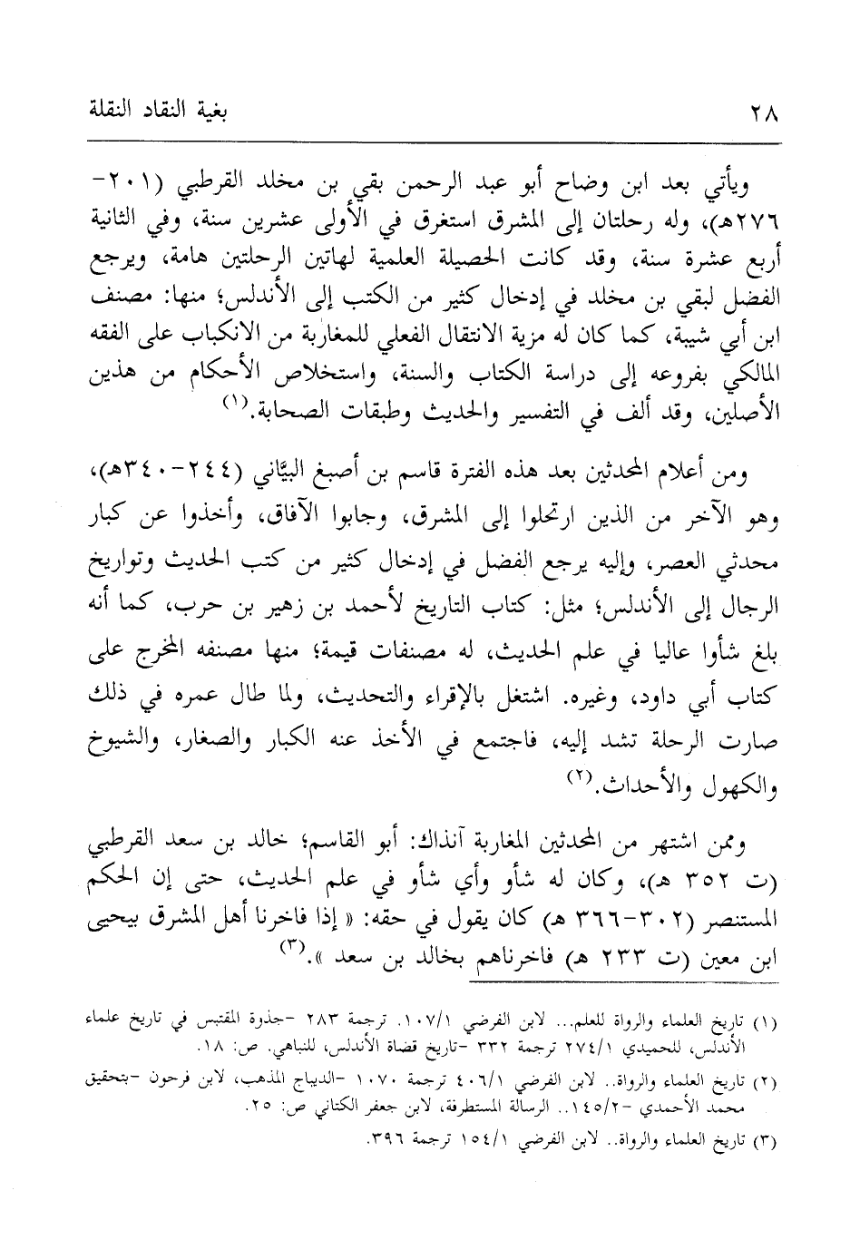 ويأتي بعد ابن وضاح أبو عبد الرحمن بقي بن مخلد القرطبي (201 - 276 هـ)، وله رحلتان إلى المشرق استغرق في الأولى عشرين سنة، وفي الثانية أربع عشرة سنة، وقد كانت الحصيلة العلمية لهاتين الرحلتين هامة، ويرجع الفضل لبقي بن مخلد في إدخال كثير من الكتب إلى الأندلس، منها: مصنف ابن أبي شيبة، كما كان له مزية الانتقال الفعلي للمغاربة من الإنكباب على الفقه المالكي بفروعه إلى دراسة الكتاب والسنة، واستخلاص الأحكام من هذين الأصلين، وقد ألف في التفسير والحديث وطبقات الصحابة. (¬1)