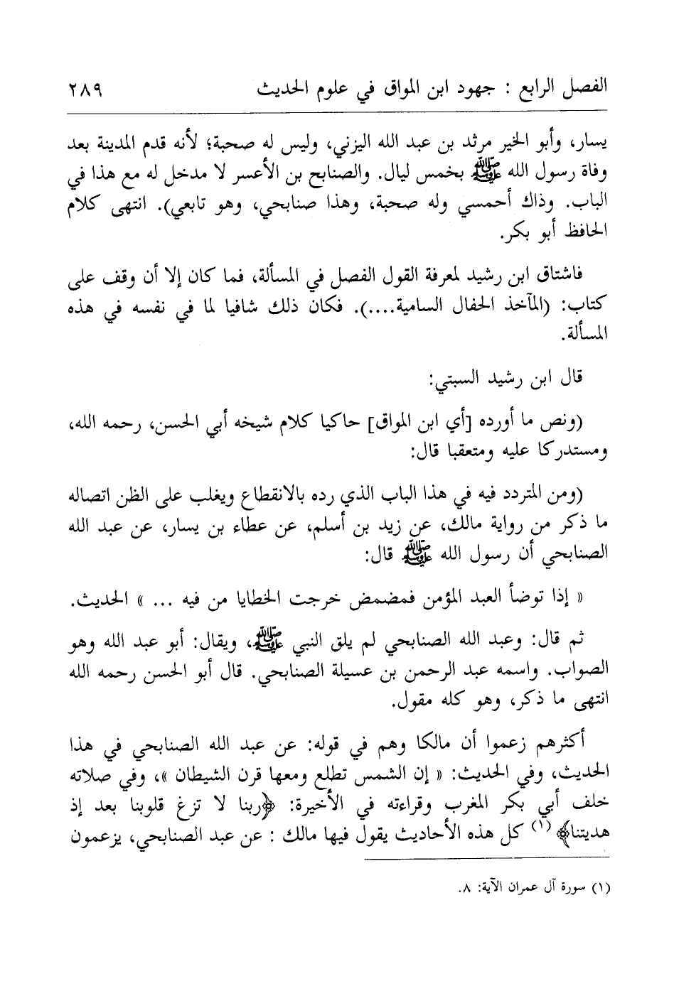 ثم قال: وعبد الله الصنابحي لم يلق النبي - صلى الله عليه وسلم -، ويقال: أبو عبد الله وهو الصواب. واسمه عبد الرحمن بن عسيلة الصنابحي. قال أبو الحصن -رَحِمَهُ اللهُ- انتهى ما ذكر، وهو كله مقول.