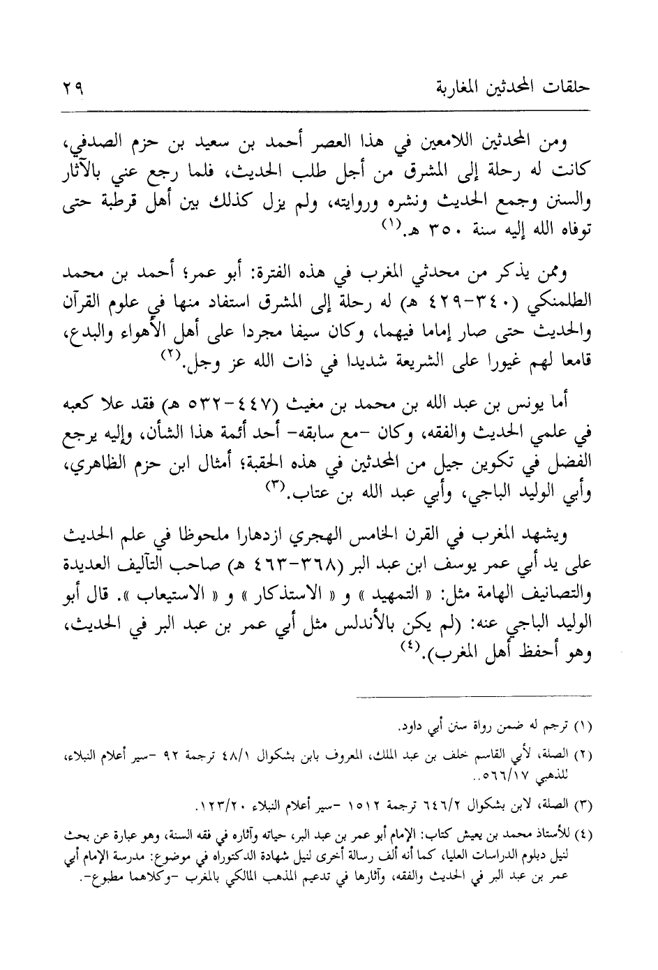 وممن يذكر من محدثي المغرب في هذه الفترة: أبو عمر، أحمد بن محمد الطلمنكي (340 - 429 هـ) له رحلة إلى المشرق استفاد منها في علوم القرآن والحديث حتى صار إمامًا فيهما، وكان سيفاً مجرداً على أهل الأهواء والبدع، قامعاً لهم غيوراً على الشريعة شديدًا في ذات الله -عَزَّ وَجَلَّ-. (¬2)
