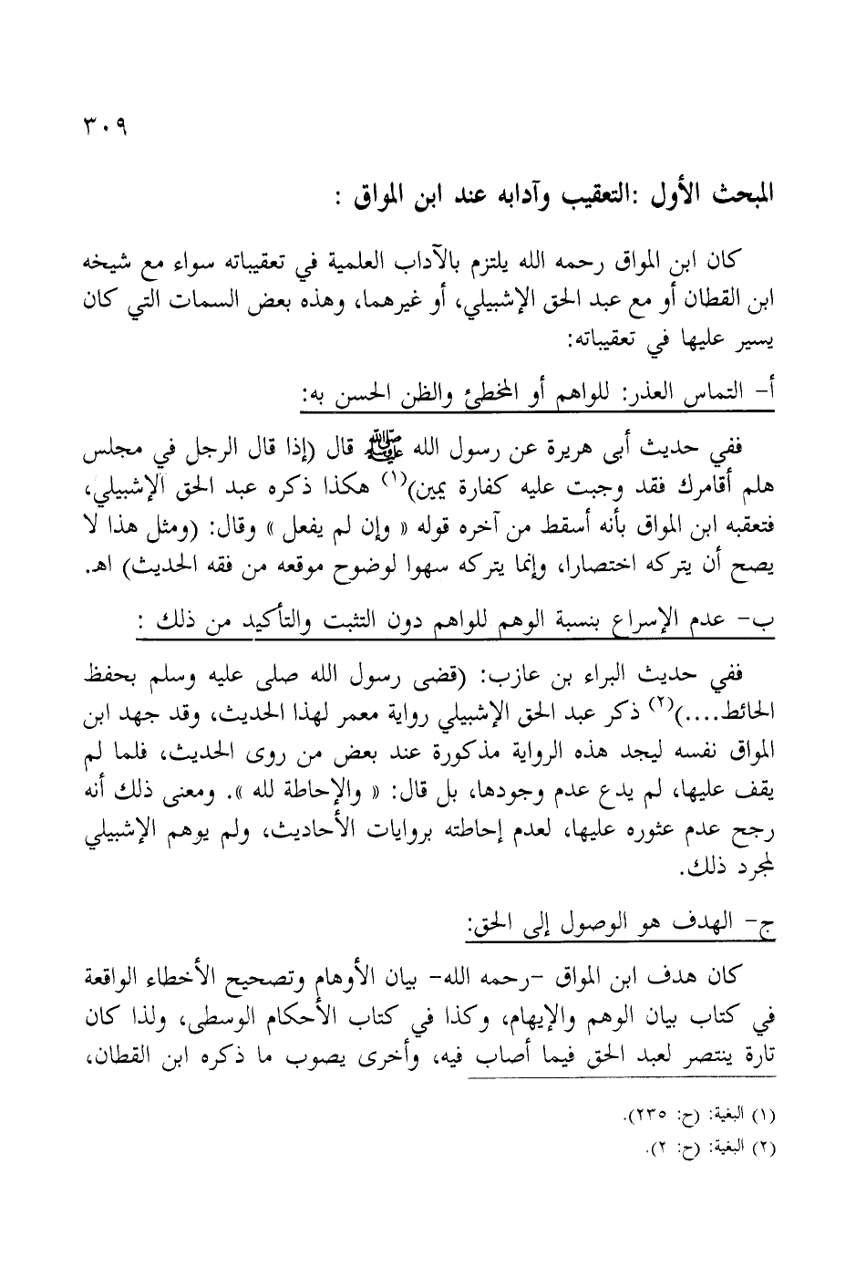 المبحث الأول: التعقيب وآدابه عند ابن المواق: