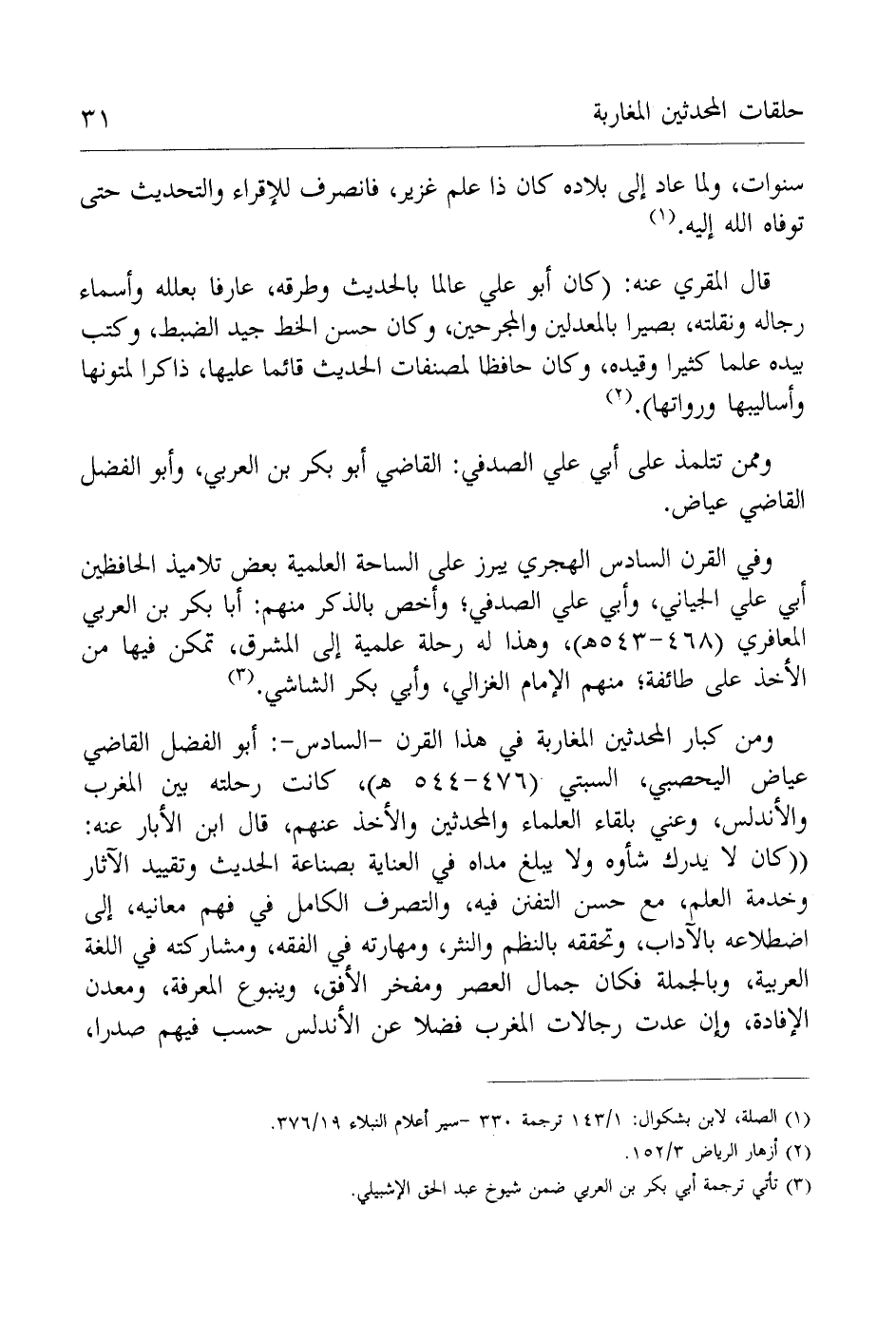 ومن كبار المحدثين المغاربة في هذا القرن -السادس-: أبو الفضل القاضي عياض اليحصبي، السبتي (476 - 544 هـ)، كانت رحلته بين الغرب والأندلس، وعني بلقاء العلماء والمحدثين والأخذ عنهم، قال ابن الأبار عنه: ((كان لا يدرك شأوه ولا يبلغ مداه في العناية بصناعة الحديث وتقييد الآثار وخدمة العلم، من حسن التفنن فيه، والتصرف الكامل في فهم معانيه، إلى اضطلاعه بالآداب، وتحققه بالنظم والنثر، ومهارته في الفقه، ومشاركته في اللغة العربية، وبالجملة فكان جمال العصر ومفخر الأفق، وينبوع المعرفة، ومعدن الإفادة، وإن عدت رجالات الغرب فضلاً عن الأندلس حسب فيهم صدراً،