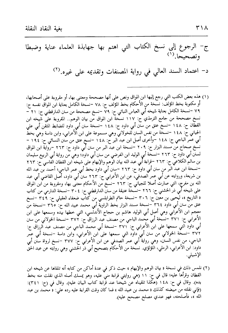 (¬1) هذه بعض الكتب الي رجع إليها ابن المواق ونص على أنها مصححة ومعتنى بها، أو مقروءة على أصحابها، أو مكتوبة بخط المؤلف: نسخة من الأحكام بخط المؤلف ح: 78 - نسخة الكامل بعناية ابن المواق نفسه ح: 79 - نسخة الكامل بعناية شيخه أبي العباس النباتي ح: 79 - نسخ مصححة من سنن الدارقطني ح: 21 - نسخ مصححة من جامع الترمذي ح: 117 نسخة ابن المواق من بيان الوهم .. المقروءة على شيخه ابن القطان ح: 148 - نسخ عتق من سنن أبي داود ح: 148 - نسخة سنن أبي داود للضابط المتقن أبي علي الجياني ح: 148 - نسخة من نفس السنن للخرلاني وهي مسموعة على ابن الأعرابي، وابن داسة وهي بخط أبي عمر الباجي ح: 148 - وأخرى أصل ابن عبد البر ح: 148 - نسخ عتق من سنن النسائي ح: 194 - نسخ صحاح من مسند البزار ح: 209 - نسخة ابن عبد البر من سنن أبي داود ح: 263 - رواية ابن المواق لسنن أبي داود ح: 263 - نسخة أبي الوليد ابن الفرضي من سنن أبي داود؛ وهي من رواية أبي الربيع سليمان بن سالم الكلاعي ح: 263 - قراءة أبي عبد الله بيان الوهم والإيهام على شيخه ابن القطان الفاسى ح: 263 - نسخة ابن عبد البر من سنن أبي داود ح: 263 - سنن أبي داود بخط أبي عمر الباجي؛ أحمد بن عبد الله بن شريعة، وروايته عن أبي عمر الصدفي، عن ابن الأعرابي ح: 263 سنن أبي داود، أصل القاضي أبي عبد الله بن مفرج، التي صارت أصلا للجياني ح: 263 - نسخ من الأحكام معتنى بها، ومقروءة من ابن المواق على شيخه أبي ذر الخشنى ح: 266 - نسخة عتيقة من سنن الدارقطني ح: 304 - نسخة الدارمي من كتاب "التاريخ"، ليحيى بن معين ح: 306 - نسخة حاتم الطرابلسي من كتاب ضعفاء العقيلي ح: 349 - نسخ عتق من سنن أبي داود 364 - نسخة مسند البزار بخط الراوية أبي محمد عبيد الله ح: 365 - نسخة من معجم ابن الأعرابي وهي أصل أبي الوليد هاشم بن حجاج الأندلسي، التي خطها بيده وسمعها على ابن الأعرابي ح: 371 - نسخة أبي محمد الباجي من مصنف عبد الرزاق ح: 372 - نسخة الخولاني من سنن أبي داود التي سمعها على ابن الأعرابي ح: 371 - نسخة أبي محمد الباجي من مصنف عبد الرزاق ح: 372 - نسخة الخولاني من سنن أبي داود التي سمعها على ابن الأعرابي، وابن داسة -نسخة أبي عمر الباجي، من نفس السنن، وهي رواية أبي عمر الصدفي عن ابن الأعرابي ح: 377 - نسخ لرواة سنن أبي داود: ابن الأعرابي، الرملي، اللؤلؤي. نسخة من الأحكام بتصحيح أبي ذر الخشني وهي روايته عن عبد الحق الإشبيلي.