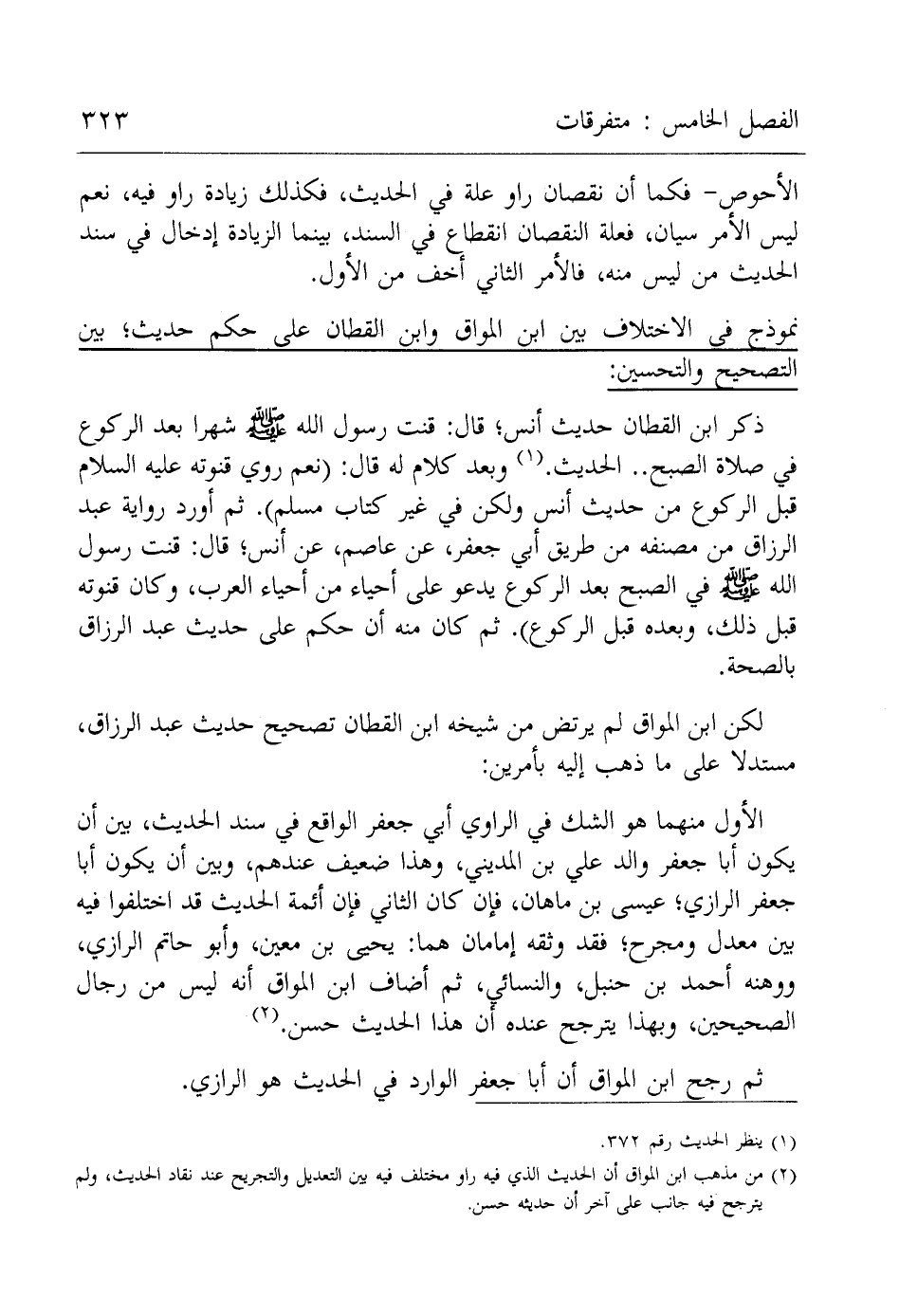 ذكر ابن القطان حديث أنس؛ قال: قنت رسول الله - صلى الله عليه وسلم - شهرا بعد الركوع في صلاة الصبح .. الحديث. (¬1) وبعد كلام له قال: (نعم روي قنوته عليه السلام قبل الركوع من حديث أنس ولكن في غير كتاب مسلم). ثم أورد رواية عبد الرزاق من مصنفه من طريق أبي جعفر، عن عاصم، عن أنس؛ قال: قنت رسول الله - صلى الله عليه وسلم - في الصبح بعد الركوع يدعو على أحياء من أحياء العرب، وكان قنوته قبل ذلك، وبعده قبل الركوع). ثم كان منه أن حكم على حديث عبد الرزاق بالصحة.