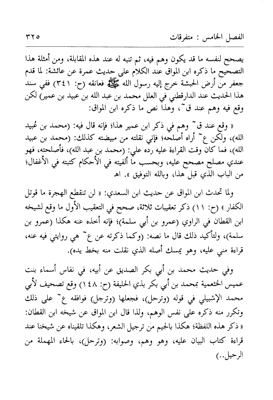 يصحح لنفسه ما قد يكون وهم فيه، ثم تنبه له عند هذه المقابلة، ومن أمثلة هذا التصحيح ما ذكره ابن المواق عند الكلام على حديث عمرة عن عائشة: لما قدم جعفر من أرض الحبشة خرج إليه رسول الله - صلى الله عليه وسلم - فعانقه (ح: 341) ففي سند هذا الحديث عند الدارقطني في العلل محمد بن عبد الله بن عبيد بن عمير) لكن وقع فيه وهم عند ق، وهذا نص ما ذكره ابن المواق: