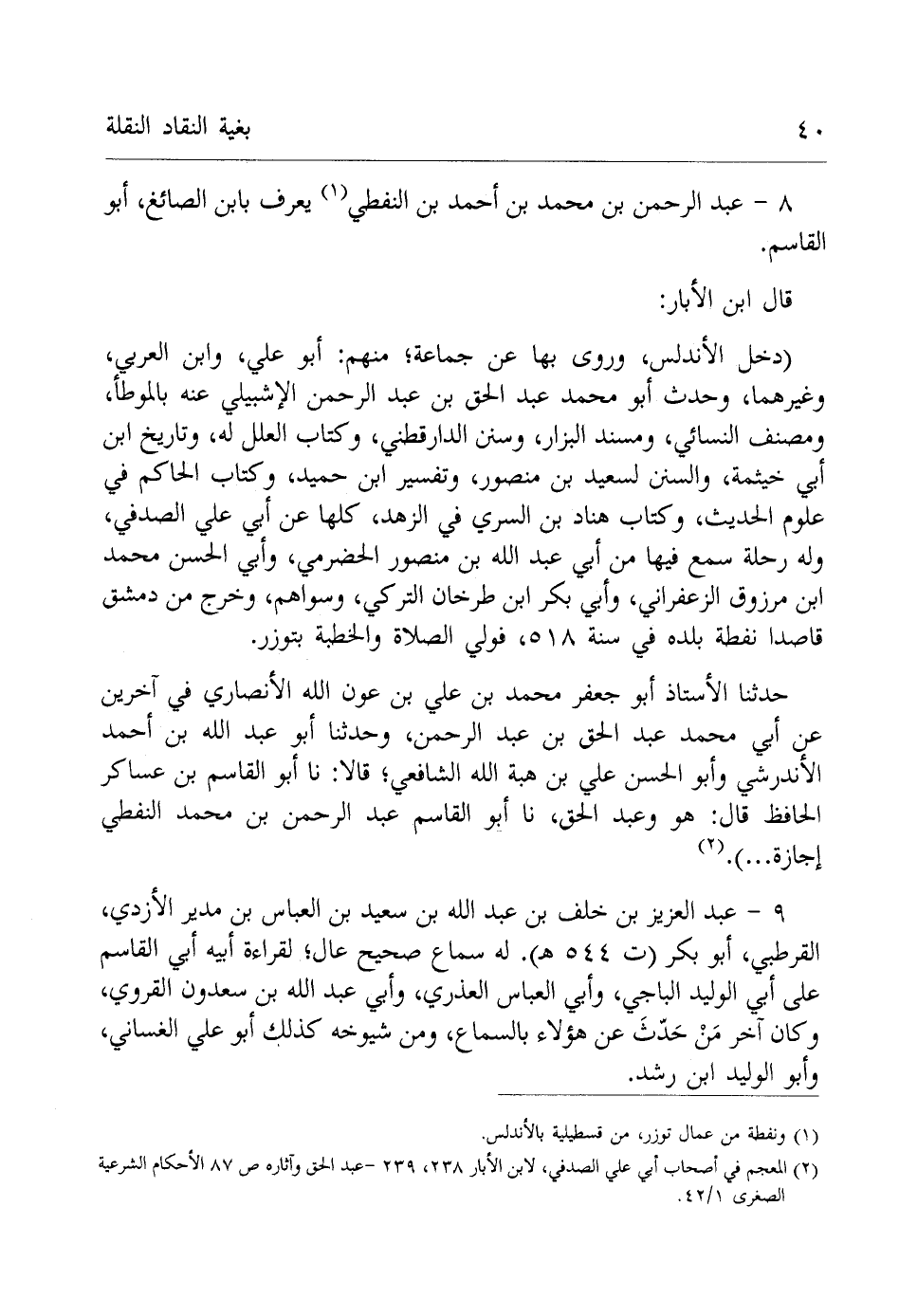(¬2) المعجم في أصحاب أبي علي الصدفي، لإبن الأبار 238، 239 - عبد الحق وآثاره ص 87 الأحكام الشرعية الصغرى 1/ 42.