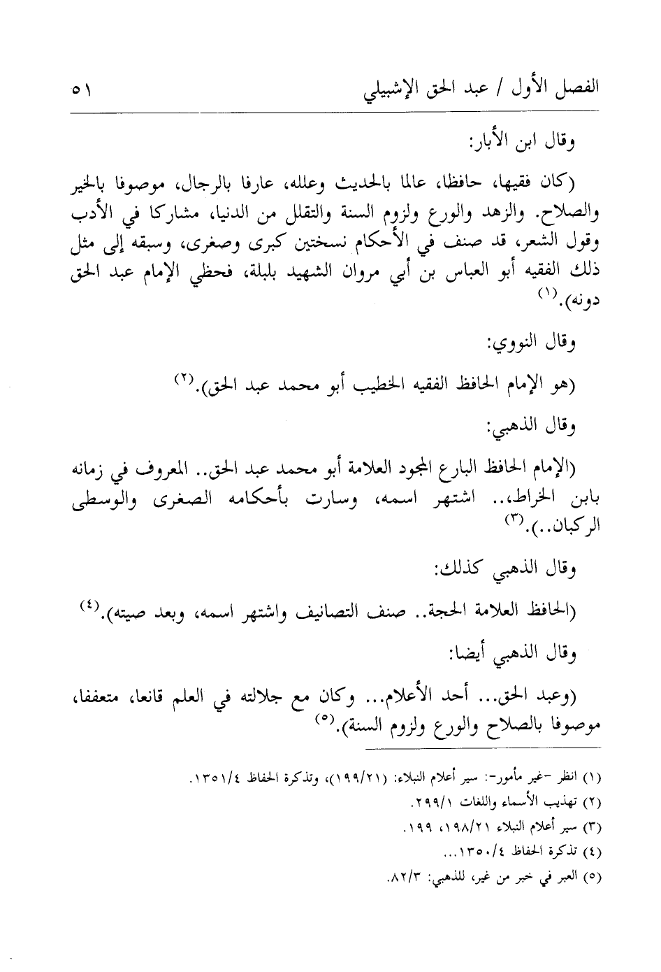 (وعبد الحق ... أحد الأعلام ... وكان مع جلالته في العلم قانعا، متعففا، موصوفا بالصلاح والورع ولزوم السنة). (¬5)