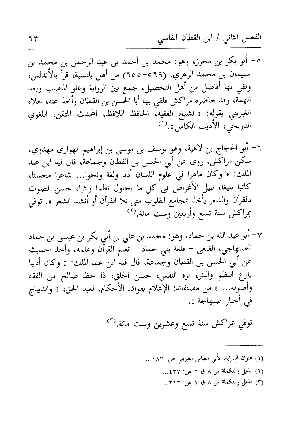 5 - أبو بكر بن محرز، وهو: محمد بن أحمد بن عبد الرحمن بن محمد بن سليمان بن محمد الزهري، (569 - 655) من أهل بلنسية، قرأ بالأندلس، ولقي بها أفاضل من أهل التحصيل، جمع بين الرواية وعلو المنصب وبعد الهمة، وفد حاضرة مراكش فلقي بها أبا الحسن بن القطان وأخذ عنه، حلاه الغبريني بقوله: "الشيخ الفقيه، الحافظ اللافظ، المحدث المتقن، اللغوي التاريخي، الأديب الكامل". (¬1)