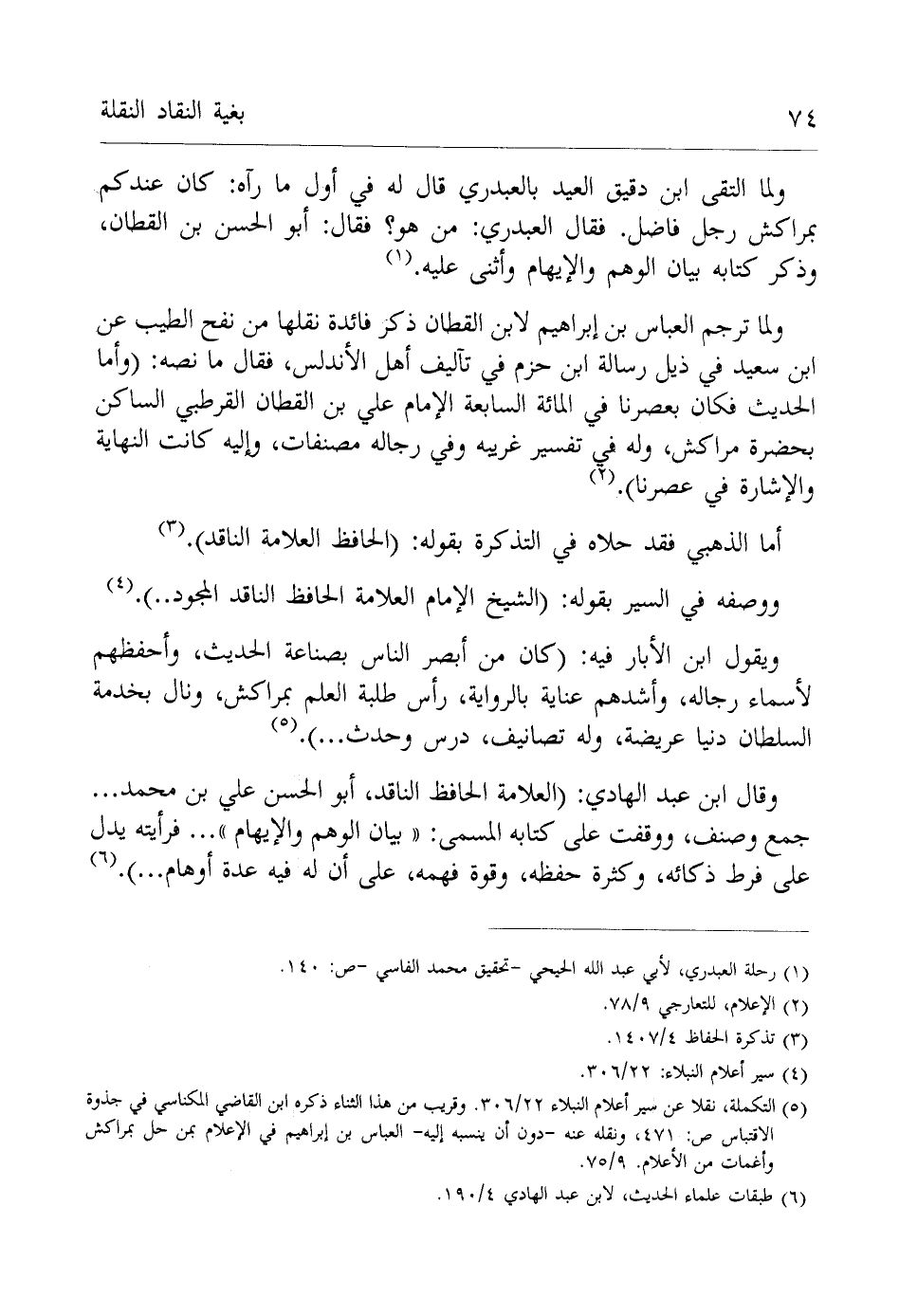 ولا التقى ابن دقيق العيد بالعبدري قال له في أول ما رآه: كان عندكم بمراكش رجل فاضل. فقال العبدري: من هو؛ فقال: أبو الحصن بن القطان، وذكر كتابه بيان الوهم والإيهام وأثنى عليه. (¬1)