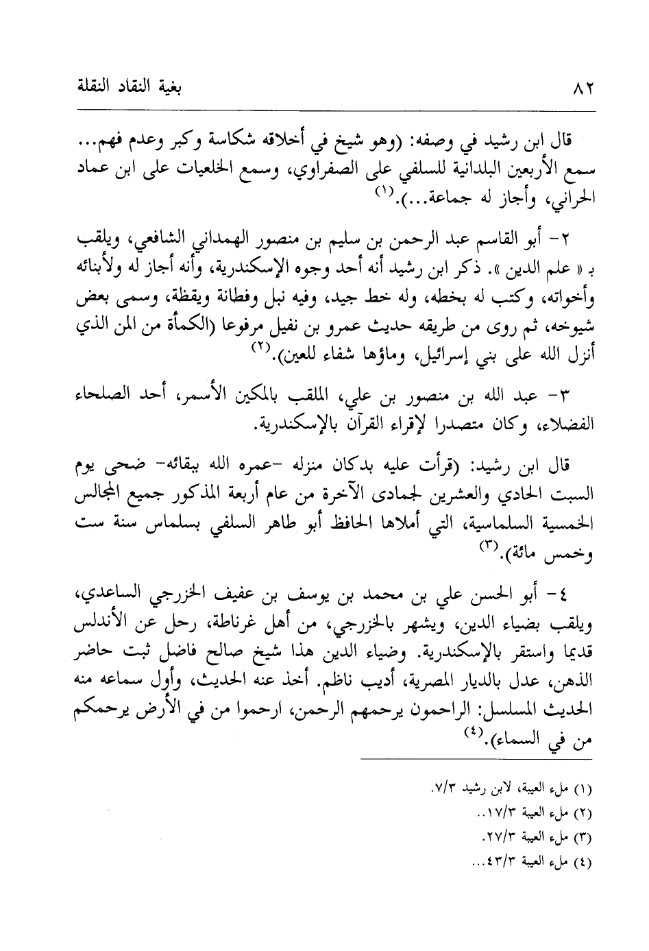2 - أبو القاسم عبد الرحمن بن سليم بن منصور الهمداني الشافعي، ويلقب بـ"علم الدين". ذكر ابن رشيد أنه أحد وجوه الإسكندرية، وأنه أجاز له ولأبنائه وأخواته، وكتب له بخطه، وله خط جيد، وفيه نبل وفطانة ويقظة، وسمى بعض شيوخه، ثم روى من طريقه حديث عمرو بن نفيل مرفوعا (الكمأة من المن الذي أنزل الله علي بني إسرائيل، وماؤها شفاء للعين). (¬2)