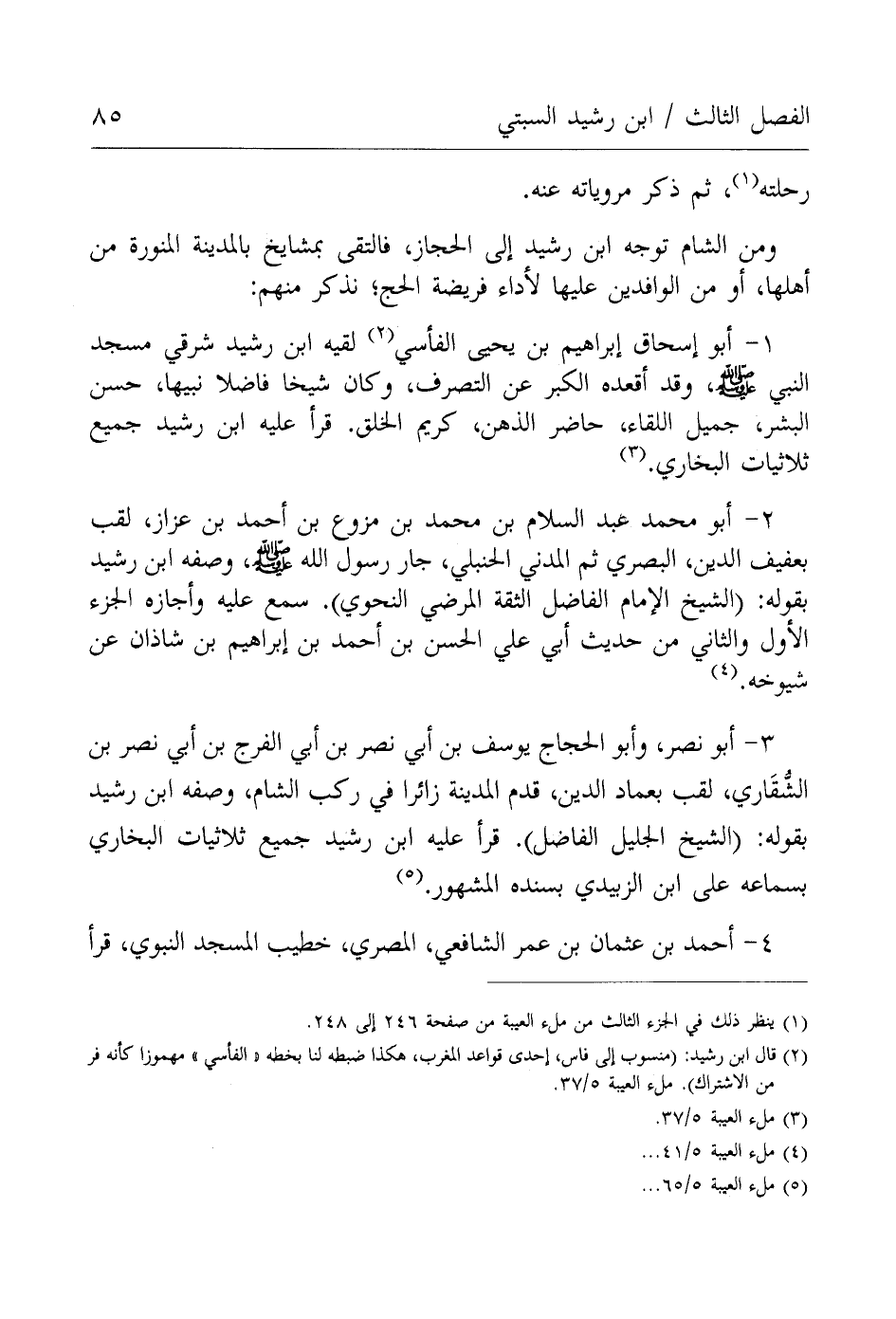 1 - أبو إسحاق إبراهيم بن يحيى الفأسي (¬2) لقيه ابن رشيد شرقي مسجد النبي - صلى الله عليه وسلم -، وقد أقعده الكبر عن التصرف، وكان شيخا فاضلا نبيها، حسن البشر، جميل اللقاء، حاضر الذهن، كريم الخلق. قرأ عليه ابن رشيد جميع ثلاثيات البخاري. (¬3)