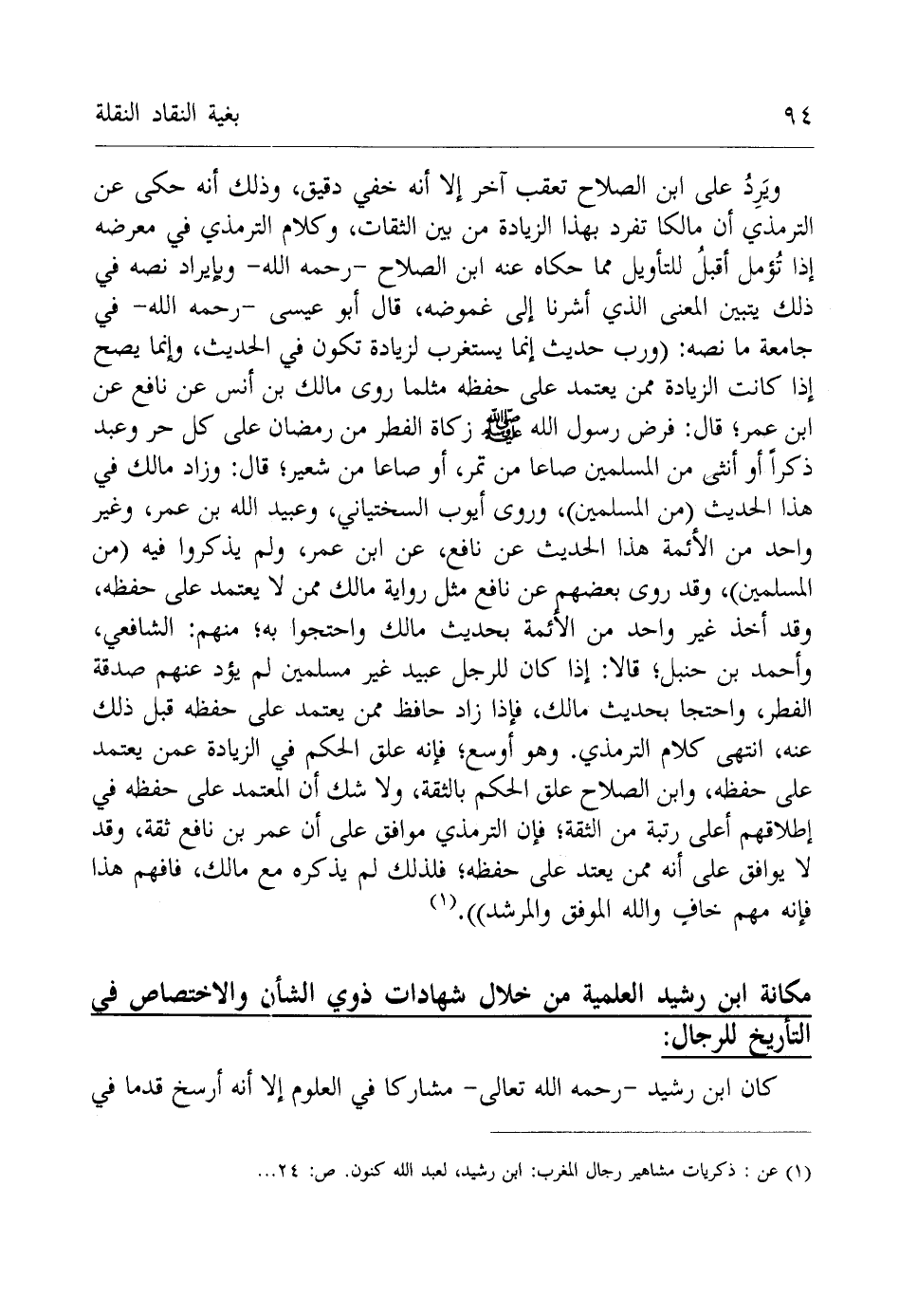 ويَرِدُ على ابن الصلاح تعقب آخر إلا أنه خفي دقيق، وذلك أنه حكى عن الترمذي أن مالكا تفرد بهذا الزيادة من بين الثقات، وكلام الترمذي في معرضه إذا تُؤمل أقبلُ للتأويل مما حكاه عنه ابن الصلاح -رَحِمَهُ اللهُ- وبإيراد نصه في ذلك يتبين المعنى الذي أشرنا إلى غموضه، قال أبو عيسى -رَحِمَهُ اللهُ- في جامعة ما نصه: (ورب حديث إنما يستغرب لزيادة تكون في الحديث، وإنما يصح إذا كانت الزيادة ممن يعتمد على حفظه مثلما روى مالك بن أنس عن نافع عن ابن عمر؛ قال: فرض رسول الله - صلى الله عليه وسلم - زكاة الفطر من رمضان على كل حر وعبد ذكرًا أو أنثى من المسلمين صاعًا من تمر، أو صاعًا من شعير؛ قال: وزاد مالك في هذا الحديث (من المسلمين)، وروى أيوب السختياني، وعبيد الله بن عمر، وغير واحد من الأئمة هذا الحديث عن نافع، عن ابن عمر، ولم يذكروا فيه (من المسلمين)، وقد روى بعضهم عن نافع مثل رواية مالك ممن لا يعتمد على حفظه، وقد أخذ غير واحد من الائمة بحديث مالك واحتجوا به؛ منهم: الشافعي، وأحمد بن حنبل؛ قالا: إذا كان للرجل عبيد غير مسلمين لم يؤد عنهم صدقة الفطر، واحتجا بحديث مالك، فإذا زاد حافظ ممن يعتمد على حفظه قبل ذلك عنه، انتهى كلام الترمذي. وهو أوسع، فإنه علق الحكم في الزيادة عمن يعتمد على حفظه، وابن الصلاح علق الحكم بالثقة، ولا شك أن المعتمد على حفظه في إطلاقهم أعلى رتبة من الثقة؛ فإن الترمذي موافق على أن عمر بن نافع ثقة، وقد لا يوافق على أنه ممن يعتد على حفظه، فلذلك لم يذكره مع مالك، فافهم هذا فإنه مهم خافٍ والله الموفّق والمرشد)). (¬1)