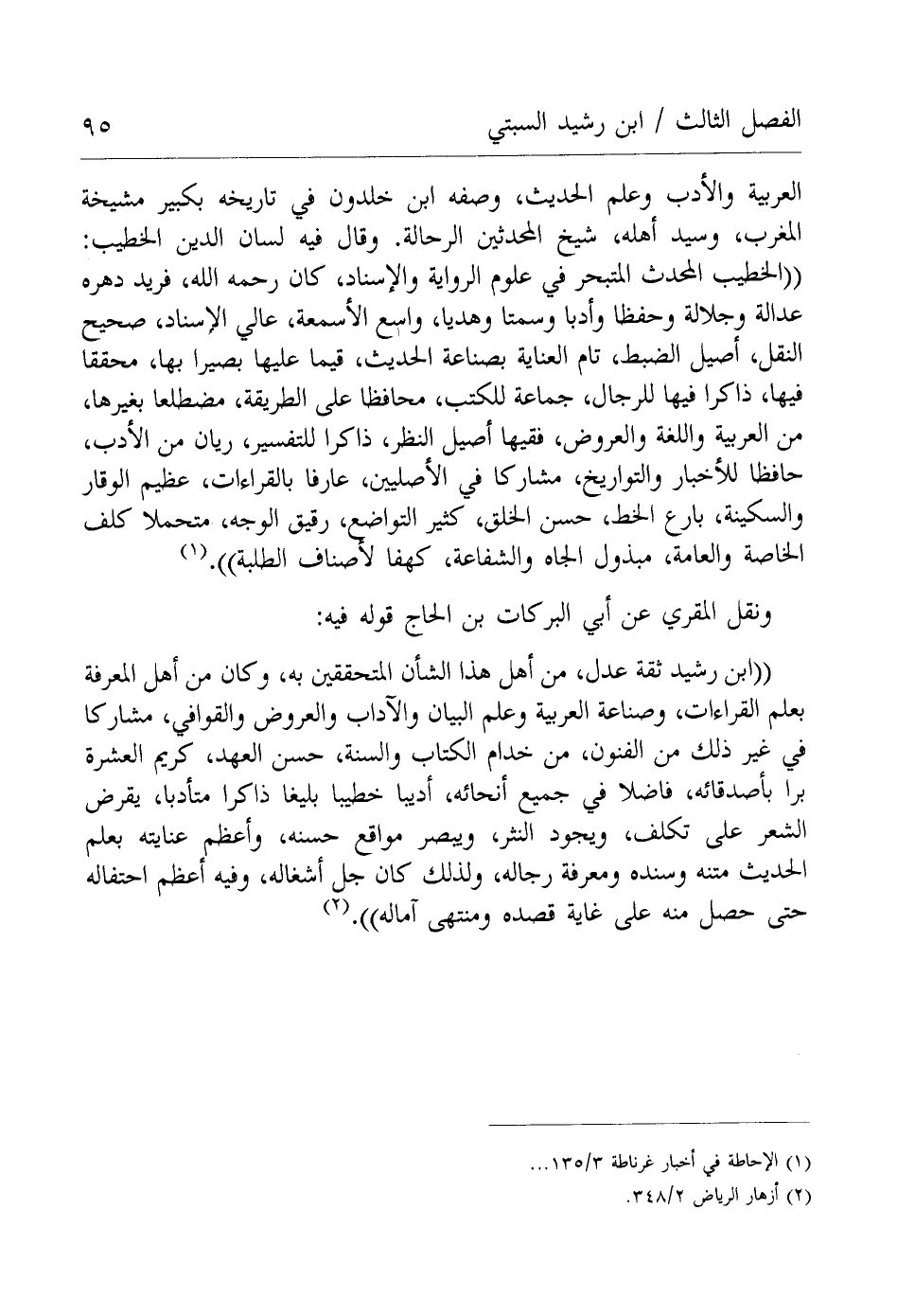 ((ابن رشيد ثقة عدل، من أهل هذا الشأن المتحققين به، وكان من أهل المعرفة بعلم القراءات، وصناعة العربية وعلم البيان والآداب والعروض والقوافي، مشاركا في غير ذلك من الفنون، من خدام الكتاب والسنة، حسن العهد، كريم العشرة برا بأصدقائه، فاضلا في جميع أنحائه، أديبا خطيبا بليغا ذاكرا متأدبا، يقرض الشعر على تكلف، ويجود النثر، وييصر مواقع حسنه، وأعظم عنايته بعلم الحديث متنه وسنده ومعرفة رجاله، ولذلك كان جل أشغاله، وفيه أعظم احتفاله حتى حصل منه على غاية قصده ومنتهى آماله)). (¬2)