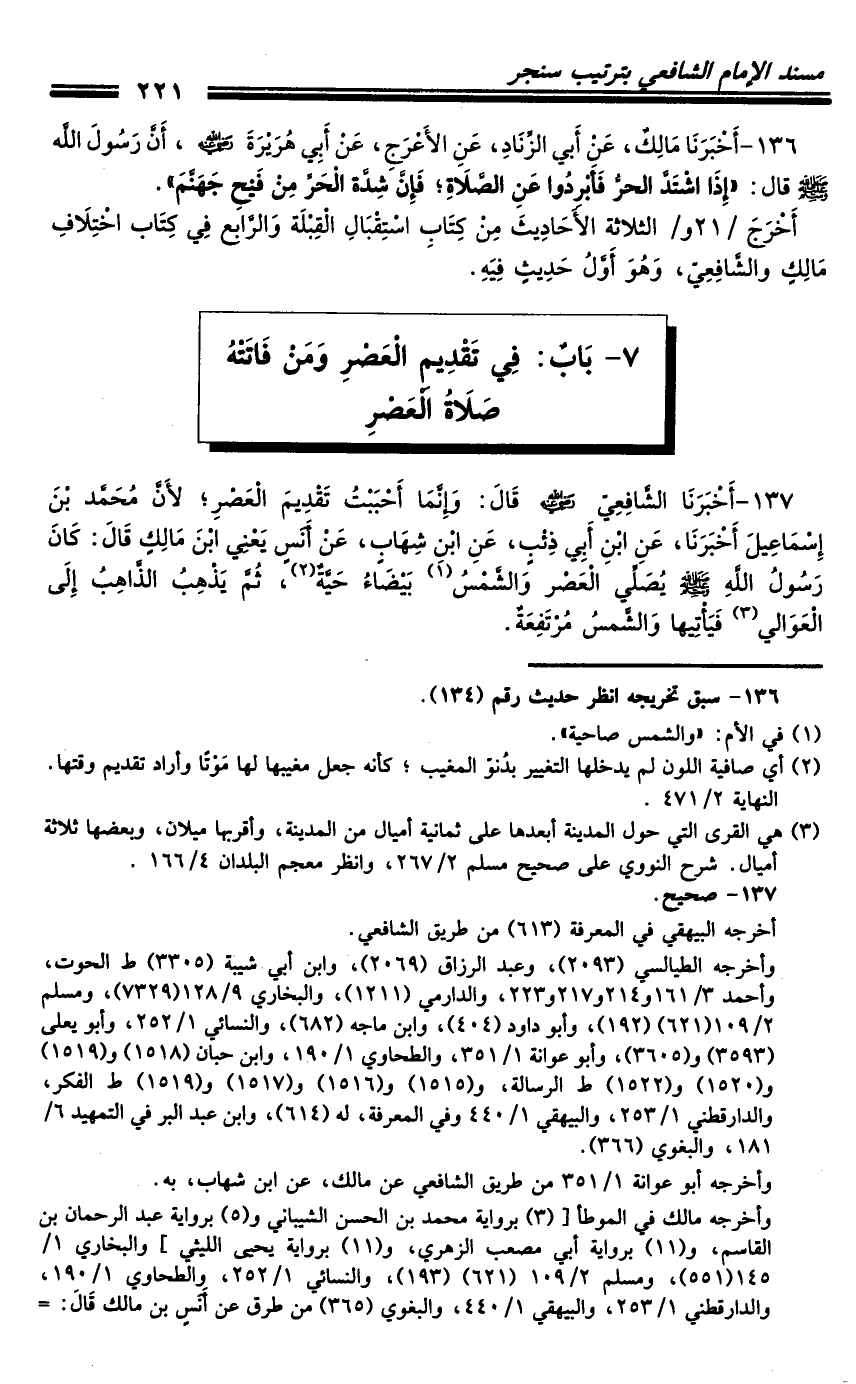 137 - أَخْبَرَنَا الشَّافِعِيُّ رَضِيَ اللَّهُ عَنْهُ، قَالَ: وَإِنَّمَا أَحْبَبْتُ تَقْدِيمَ الْعَصْرِ؛ لأَنَّ مُحَمَّدَ بْنَ إِسْمَاعِيلَ أَخْبَرَنَا، عَنِ ابْنِ أَبِي ذِئْبٍ، عَنِ ابْنِ شِهَابٍ، عَنْ أَنَسٍ، يَعْنِي: ابْنَ مَالِكٍ، قَالَ: كَانَ رَسُولُ اللَّهِ صَلَّى اللَّهُ عَلَيْهِ وَسَلَّمَ يُصَلِّي الْعَصْرَ وَالشَّمْسُ بَيْضَاءُ حَيَّةٌ، ثُمَّ يَذْهَبُ الذَّاهِبُ إِلَى الْعَوَالِي فَيَأْتِيهَا وَالشَّمْسُ مُرْتَفِعَةٌ.