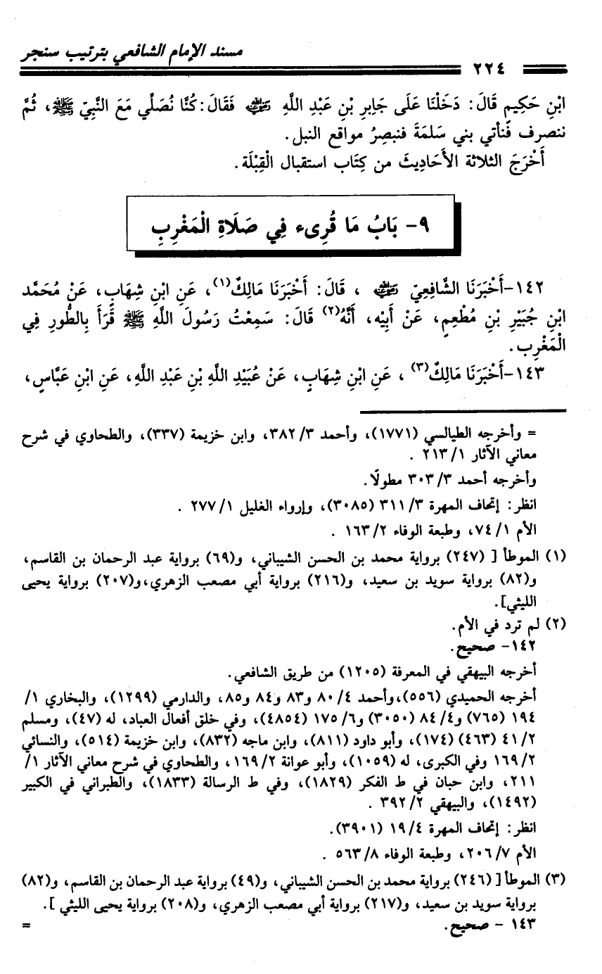 142 - أَخْبَرَنَا الشَّافِعِيُّ رَضِيَ اللَّهُ عَنْهُ، قَالَ: أَخْبَرَنَا مَالِكٌ، عَنِ ابْنِ شِهَابٍ، عَنْ مُحَمَّدِ بْنِ جُبَيْرِ بْنِ مُطْعِمٍ، عَنْ أَبِيهِ، أَنَّهُ قَالَ: سَمِعْتُ رَسُولَ اللَّهِ صَلَّى اللَّهُ عَلَيْهِ وَسَلَّمَ قَرَأَ بِ الطُّورِ فِي الْمَغْرِبِ.