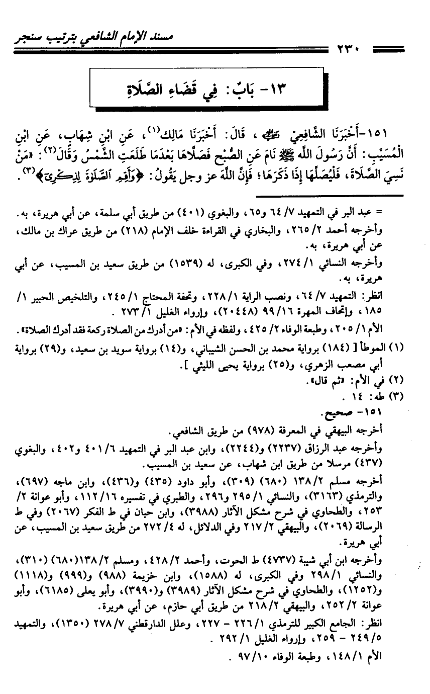 151 - أَخْبَرَنَا الشَّافِعِيُّ رَضِيَ اللَّهُ عَنْهُ، قَالَ: أَخْبَرَنَا مَالِكٌ، عَنِ ابْنِ شِهَابٍ، عَنِ ابْنِ الْمُسَيِّبِ: أَنَّ رَسُولَ اللَّهِ صَلَّى اللَّهُ عَلَيْهِ وَسَلَّمَ نَامَ عَنِ الصُّبْحِ فَصَلاهَا بَعْدَمَا طَلَعَتِ الشَّمْسُ، وَقَالَ: " مَنْ نَسِيَ الصَّلاةَ، فَلْيُصَلِّهَا إِذَا ذَكَرَهَا، فَإِنَّ اللَّهَ عَزَّ وَجَلَّ يَقُولُ: {وَأَقِمِ الصَّلاةَ لِذِكْرِي} [طه: 14] .