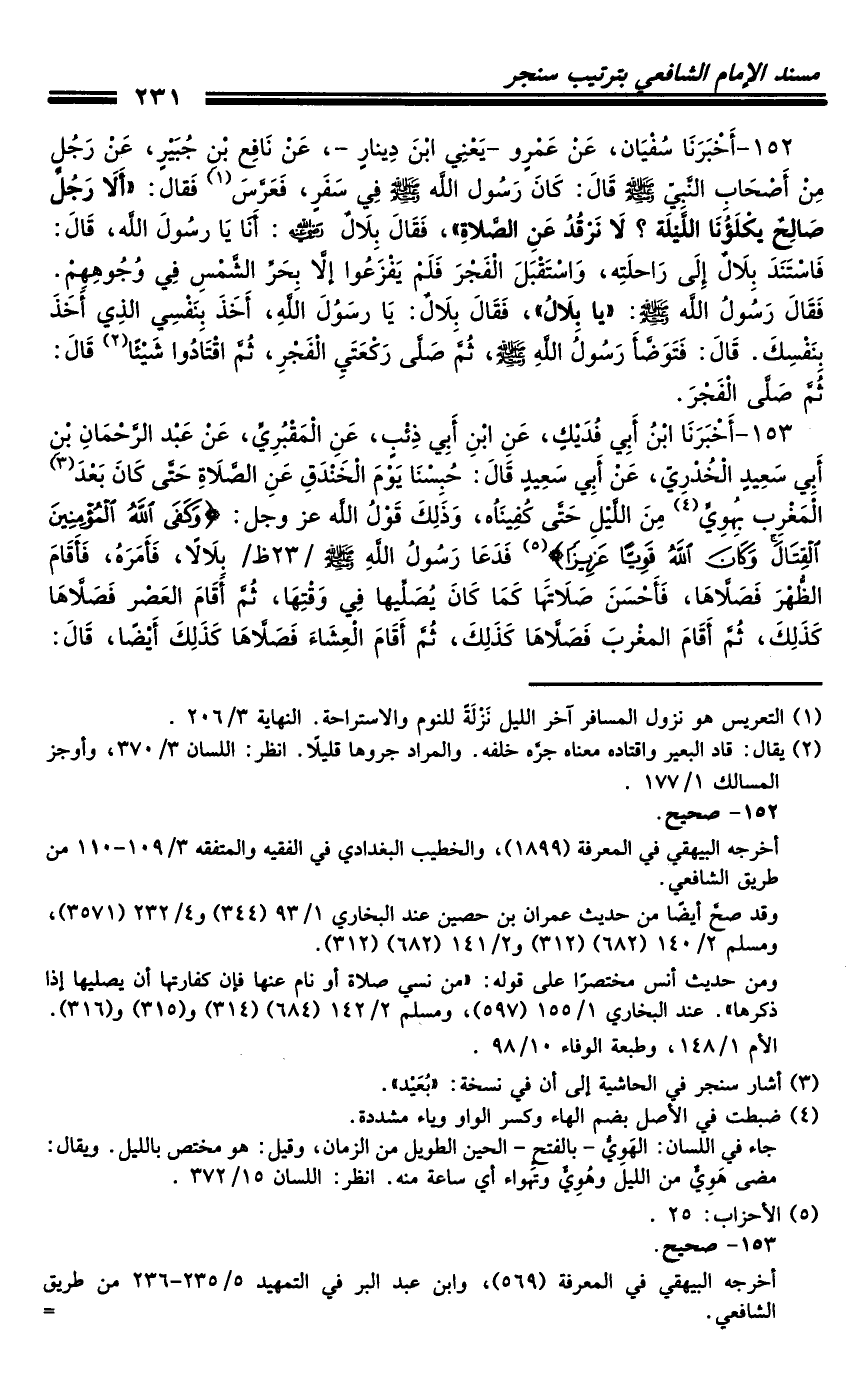 152 - أَخْبَرَنَا سُفْيَانُ، عَنْ عَمْرٍو، يَعْنِي: ابْنَ دِينَارٍ، عَنْ نَافِعِ بْنِ جُبَيْرٍ، عَنْ رَجُلٍ مِنْ أَصْحَابِ النَّبِيِّ صَلَّى اللَّهُ عَلَيْهِ وَسَلَّمَ قَالَ: كَانَ رَسُولُ اللَّهِ صَلَّى اللَّهُ عَلَيْهِ وَسَلَّمَ فِي سَفَرٍ، فَعَرَّسَ، فَقَالَ: «أَلا رَجُلٌ صَالِحٌ يَكْلَؤُنَا اللَّيْلَةَ؟ لا نَرْقُدُ عَنِ الصَّلاةِ» ، فَقَالَ بِلالٌ رَضِيَ اللَّهُ عَنْهُ: أَنَا يَا رَسُولَ اللَّهِ، قَالَ: فَاسْتَنَدَ بِلالٌ إِلَى رَاحِلَتِهِ، وَاسْتَقْبَلَ الْفَجْرَ فَلَمْ يَفْزَعُوا إِلا بِحَرِّ الشَّمْسِ فِي وُجُوهِهِمْ.
